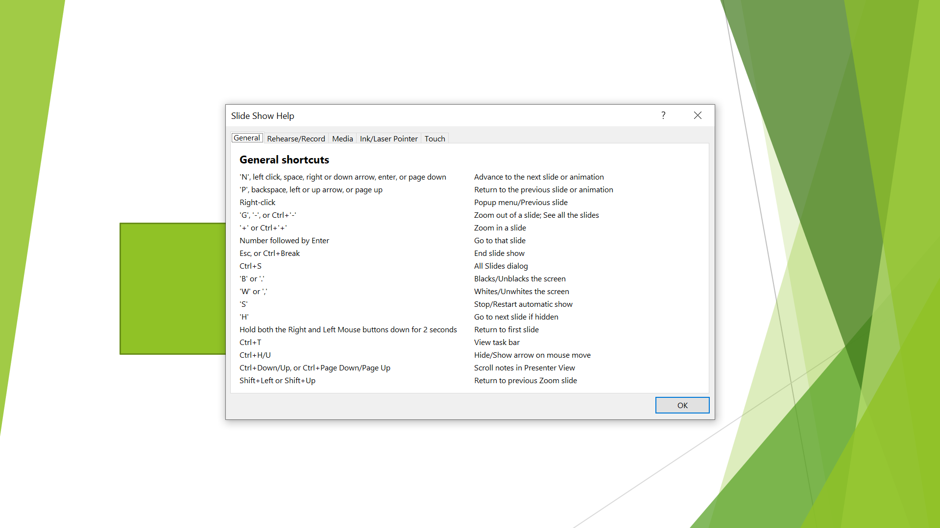 আপনি যখন প্রেজেন্টেশন সবার সামনে প্রেজেন্ট করবেন তখন প্রফেশনালিটি মেইনটেইনের জন্য আপনার কিছু শর্টকাট কী অবশ্যই জেনে নেয়া উচিৎ। আর আপনি যদি সকল শর্টকাট জেনে নিতে চান তাহলে প্রেজেন্টেশনের সময় F1 এ প্রেস করুন।