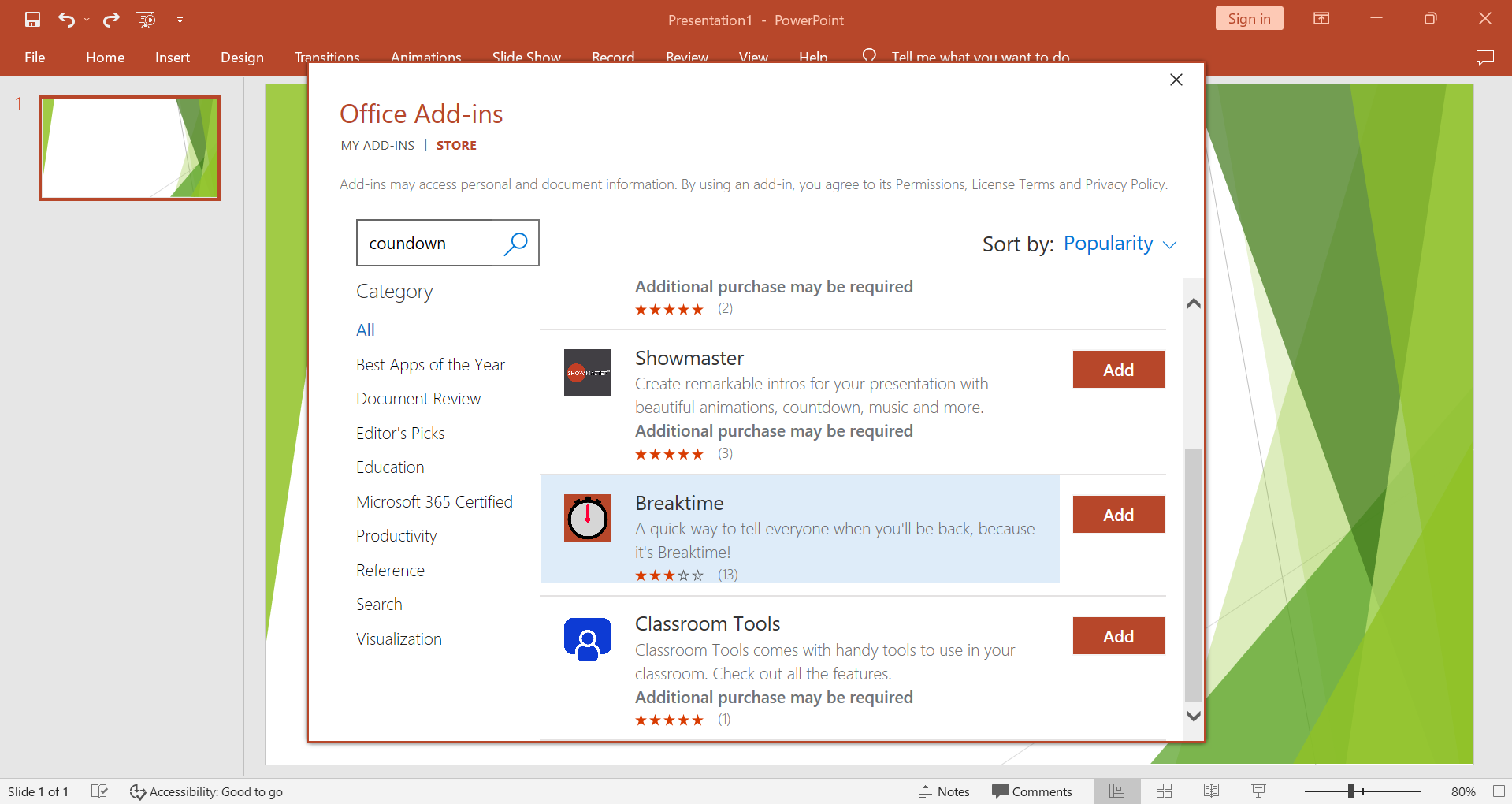 আপনার স্লাইডে আপনি যোগ করতে পারবেন কাউন্ট ডাউন। এজন্য প্রথমে পাওয়ার পয়েন্ট ওপেন করুন, Insert> Get Add-ins যান এবং Count Down লিখে সার্চ দিয়ে। কাউন্ট ডাউন যোগ করে নিন।
