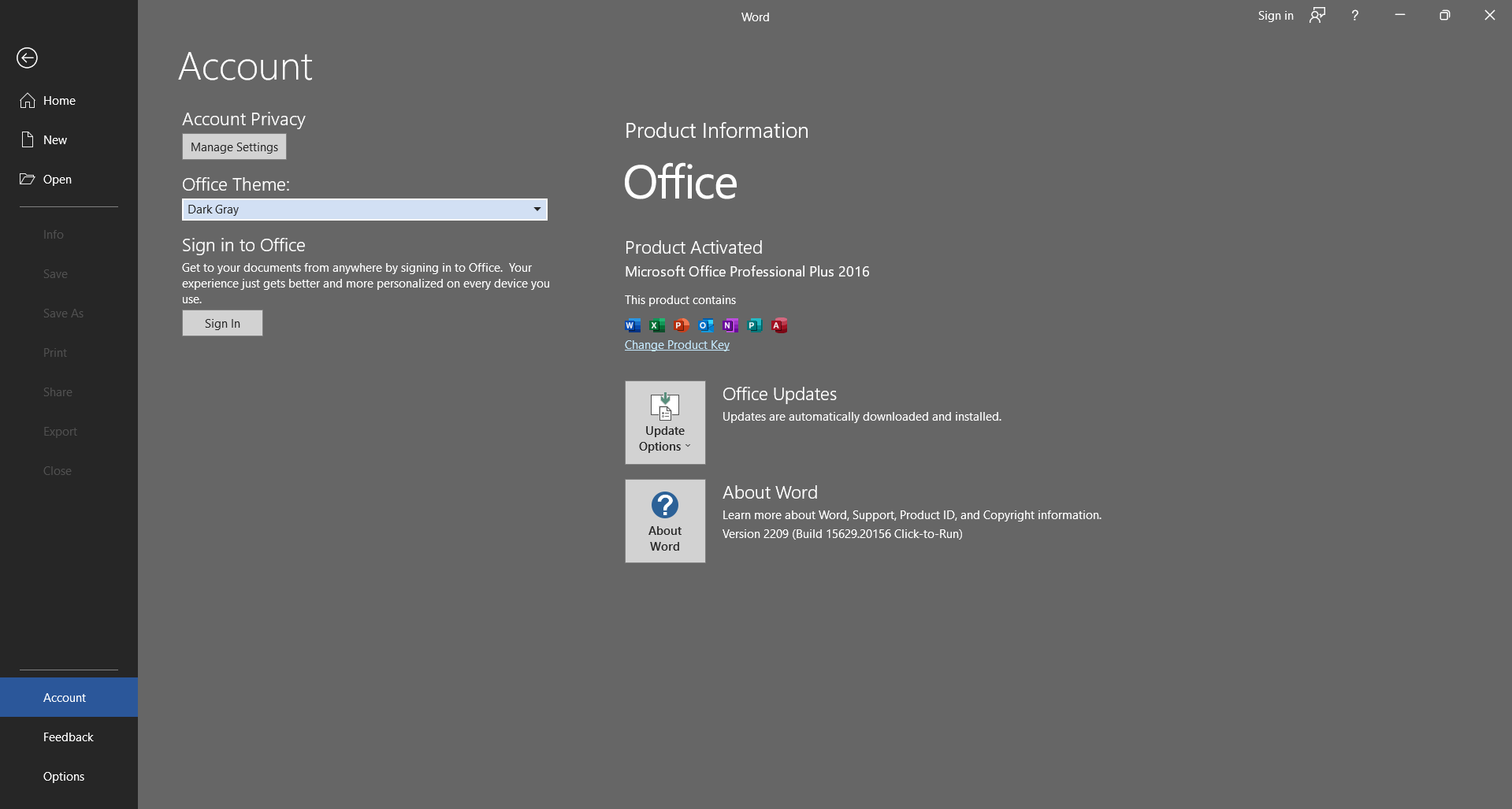 আপনি চাইলে সহজেই মাইক্রোসফট ওয়ার্ডে ডার্ক মুড এনেভল করতে পারবেন। চলে যান Account > Office Theme এবং সিলেক্ট করুন Dark Gray, ব্যাস আপনার ডার্ক মুড এনেভল হয়ে গেল।