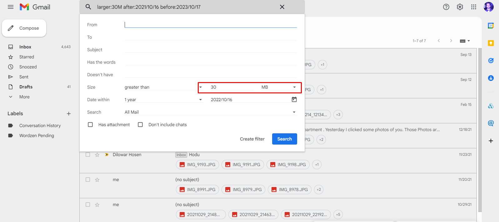 ফিল্টার থেকে ফাইল সাইজ সিলেক্ট করুন। এখান আপনাকে নির্দিষ্ট সাইজের ইমেইল গুলো দেখাবে। ইচ্ছে মত ডিলিট করে দিন।