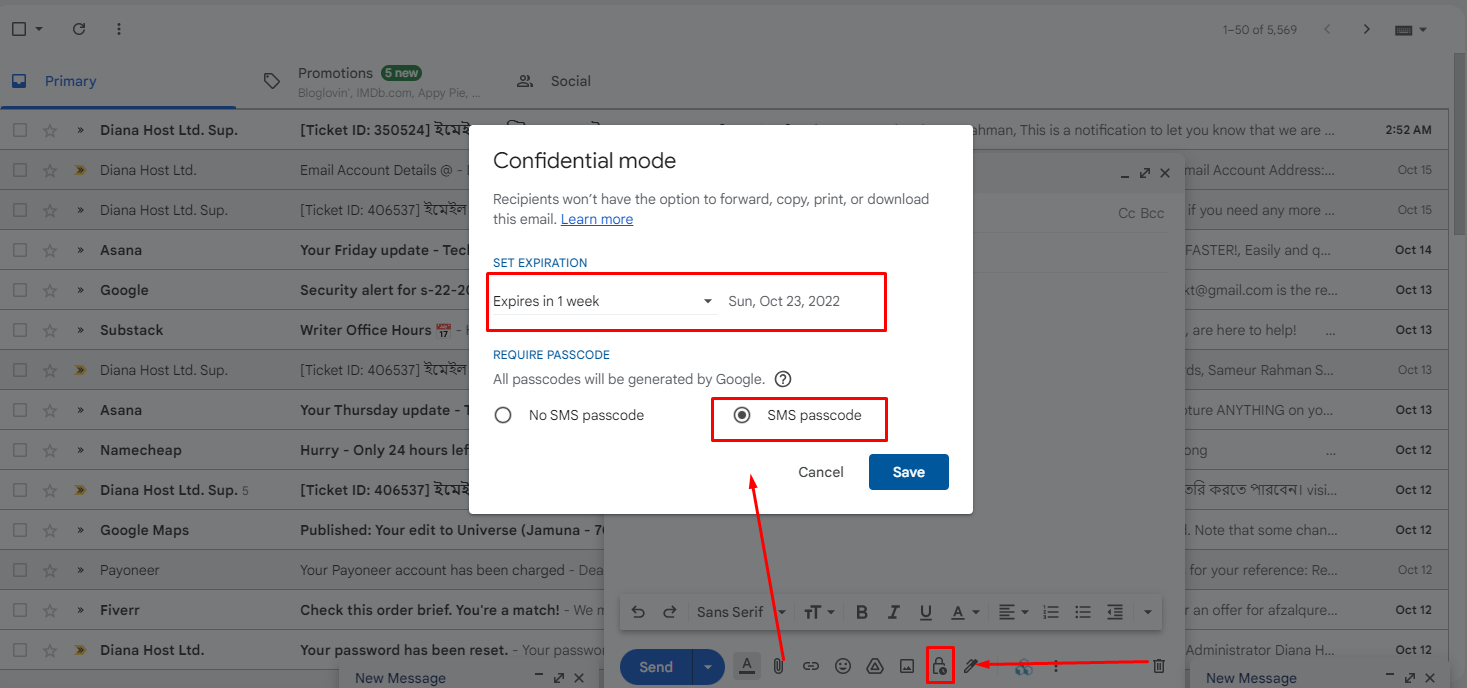 Compose এ ক্লিক করুন এবং Toggle Confidential mode সিলেক্ট করুন এবার এক্সাপায়ার টাইম সিলেক্ট করুন চাইলে পাসকোডও দিতে পারেন।