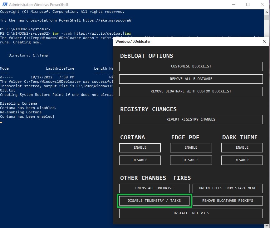 এর পর “Disable Telemetry/ Tasks“ এ ক্লিক করুন। এটা করার ফলে ব্যকগ্রাউন্ডে মাইক্রোসফটের ট্র্যাকিং ডিজেবল হয়ে যাবে। এতে রিসোর্স ইউজও কমবে এবং প্রাইভেসি ইস্যুতেও এটি কাজে আসবে।
