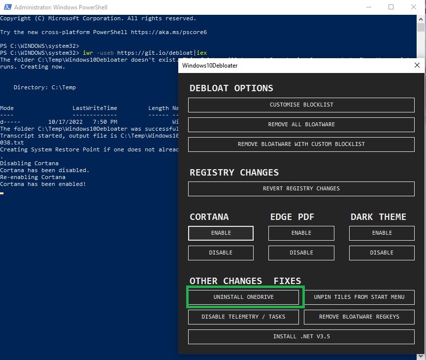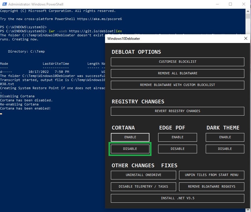 ফাইল ডাউনলোড হয়ে গেলে নতুন একটি উইন্ডো আসবে। এখান থেকে আপনি সহজে কিছু বিষয় ডিজেবল করে দিতে পারবেন। যেমন Cortana ডিজেবল করতে চাইলে Disable ক্লিক করে দিন।