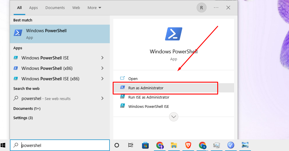 প্রথমে “powershell” লিখে সার্চ করুন, অ্যাপটি খুঁজে পেলে Run as Administrator এ ক্লিক করুন।
