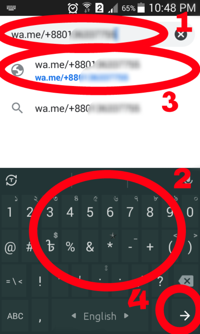 এরপর আপনার সামনে এমন একটা পেজ আসবে। এইখানে নাম্বার 1 এ আপনি লেখার অপশন দেখতে পাবেন। নাম্বার 2 এ আপনি নিচে কীবোর্ড দেখতে পাবেন। লেখার জায়গাতে আপনি wa.me/+88 এই লেখাটি লিখে তারপর আপনার সেই ফ্রেন্ড এর নম্বরটি বসিয়ে দিন কোনো প্রকার স্পেস ছাড়া একদম আমার নিচের ছবির মত করে। এরপর নম্বর 3 এ দেখানো লিংক এ অথবা নম্বর 4 এ দেখানো বাটনে ক্লিক করুন।