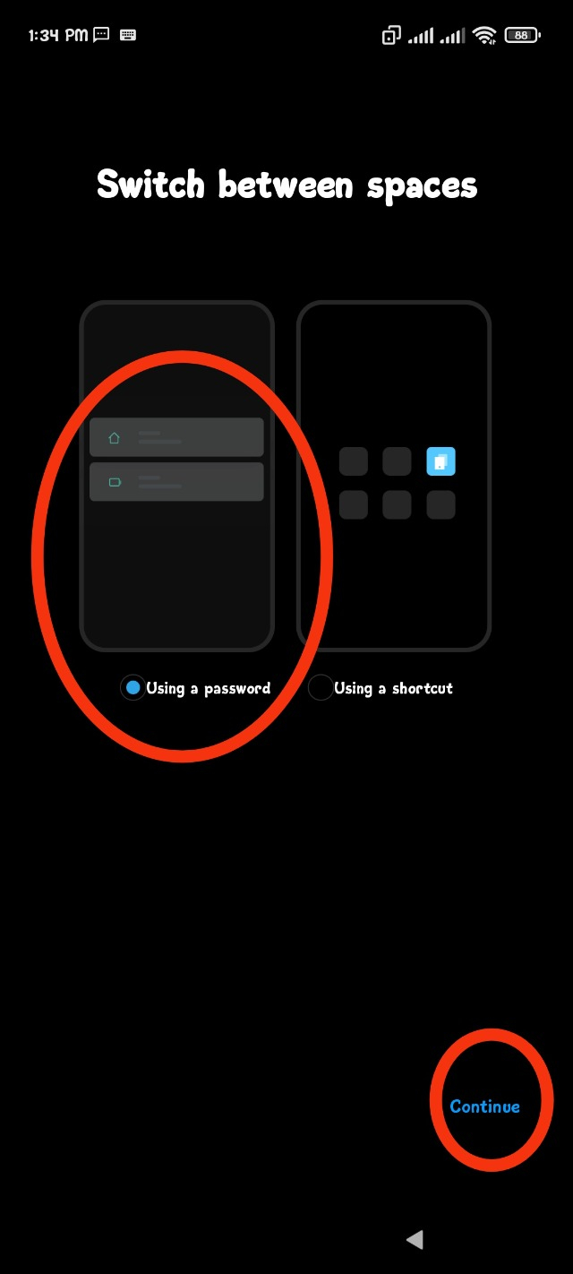 আর দ্বিতীয় অপশন টি হচ্ছে Using A Shortcurt. ইহার মাধ্যমে কোনো পাসওয়ার্ড এর প্রয়োজন নেই। জাস্ট আপনার স্কিন এ একটি শর্টকার্ট বাটন থাকবে এবং আপনি সেই বাটনে ক্লিক করলে আপনার পার্টনার এর স্পেস এ চলে যাবে এবং আবার ক্লিক করলে আপনার স্পেস এ ফিরে আসবে। তো আমি Using A Pasword এ ক্লিক করছি। আপনিও Using A Pasword এ ক্লিক করে Continue এ ক্লিক করুন।