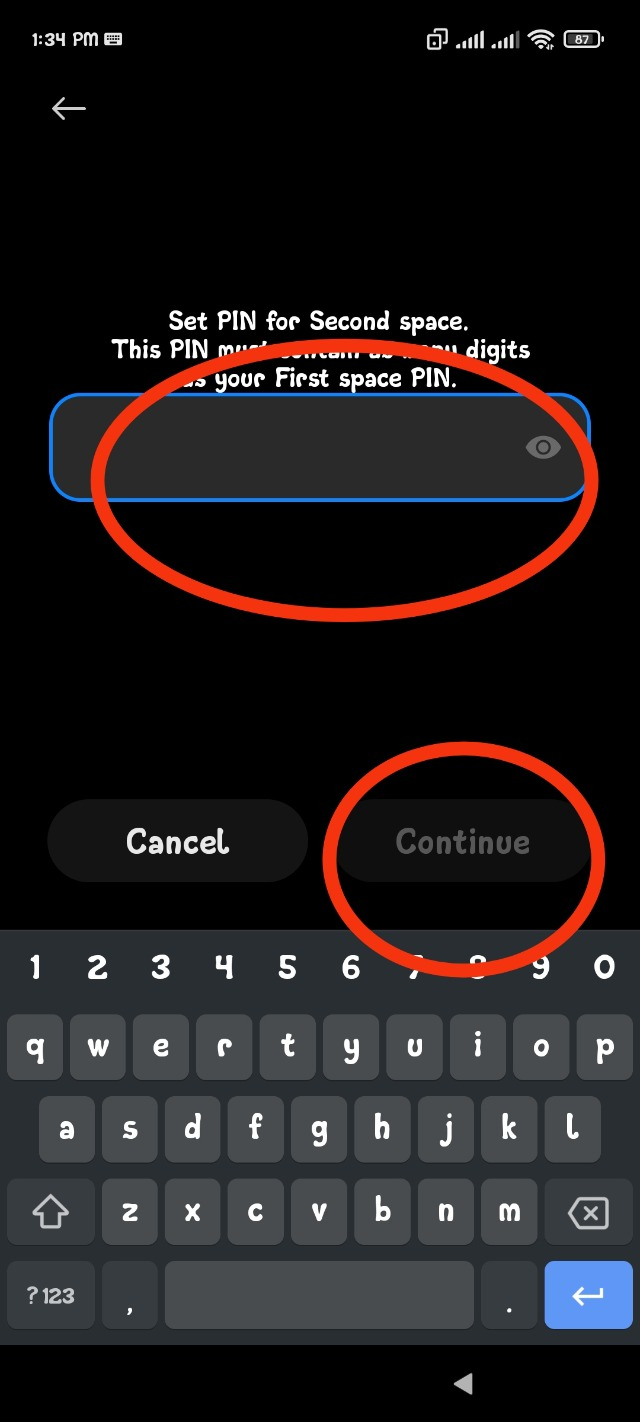 এরপর আপনার Second Space তৈরি করার জন্য পাসওয়ার্ড সেট করার অপশন আসবে। তো আপনি Second স্পেস তৈরির জন্য একটি পাসওয়ার্ড সেট করে নিবেন। (প্রথমত মনে রাখবেন, আপনার ফোনে এতদিন ধরে যেই পাসওয়ার্ড টি আপনি ব্যবহার করতেছেন, সেই পাসওয়ার্ড এর সাথে যেনো এখন যেই পাসওয়ার্ড টি লিখবেন সেটি ম্যাচ না করে। অর্থাৎ এতদিন ধরে যেই পাসওয়ার্ড টি আপনি ব্যবহার করতেছেন সেই পাসওয়ার্ড টির থেকে যেনো এই পাসওয়ার্ড টি আলাদা হয়ে থাকে। অর্থাৎ দুটো পাসওয়ার্ড যেনো দুই রকমের হয়। আশাকরি বুঝতে পেরেছি।