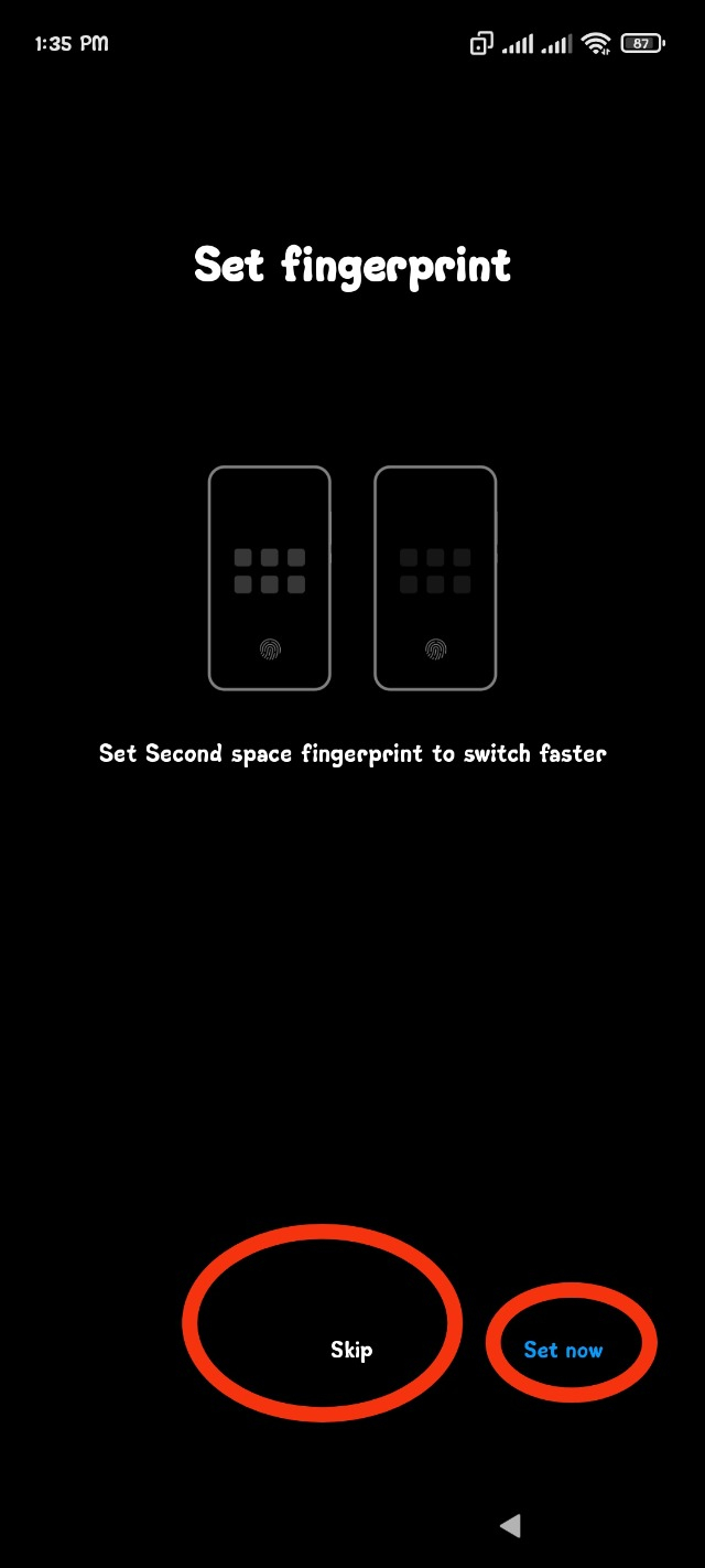 এতে করে ফোন টি আপনার মত হয়ে আপনার স্পেস টি ওপেন হয়ে যাবে। আপনার আপনার পার্টনার যদি ফোন টি ওপেন করার জন্য তার ফোন টি ব্যবহার করে তাহলেই ফোনটি তার মতো করে তার স্পেস টি ওপেন হবে। তো আমি এই অপশন টি স্কিপ করে দিতে চাচ্ছি। তো আপনারা যারা দুটো স্পেস জন্য দুই জনের ফিঙ্গার প্রিন্ট ব্যবহার করতে চান তারা Set Now এ ক্লিক করে দুজনের ফিঙ্গারপ্রিন্ট সেট করে নিতে পারেন।