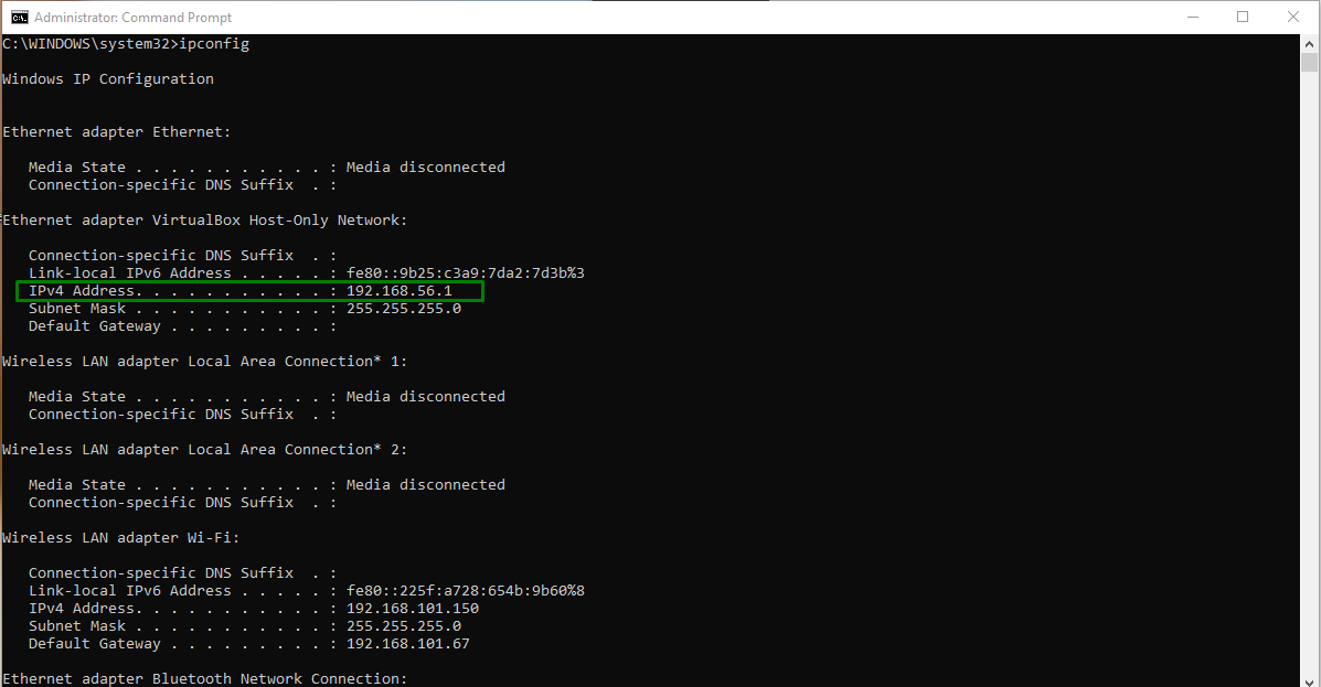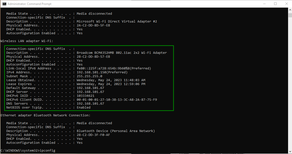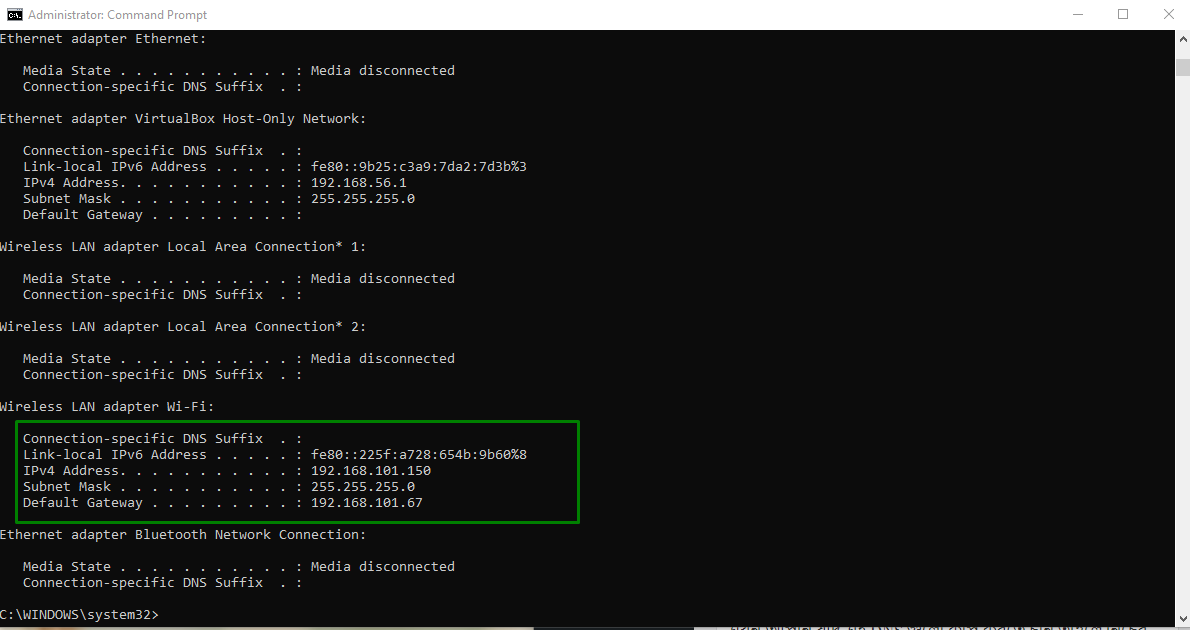 আপনি যদি আপনার পিসির আইপি এড্রেস জানতে চান তাহলে নিচের কমান্ডটি দিন। এটি আপনার আইপি এড্রেস শো করবে। IPV4 Address থেকে আপনি আইপি এড্রেস দেখতে পাবেন।