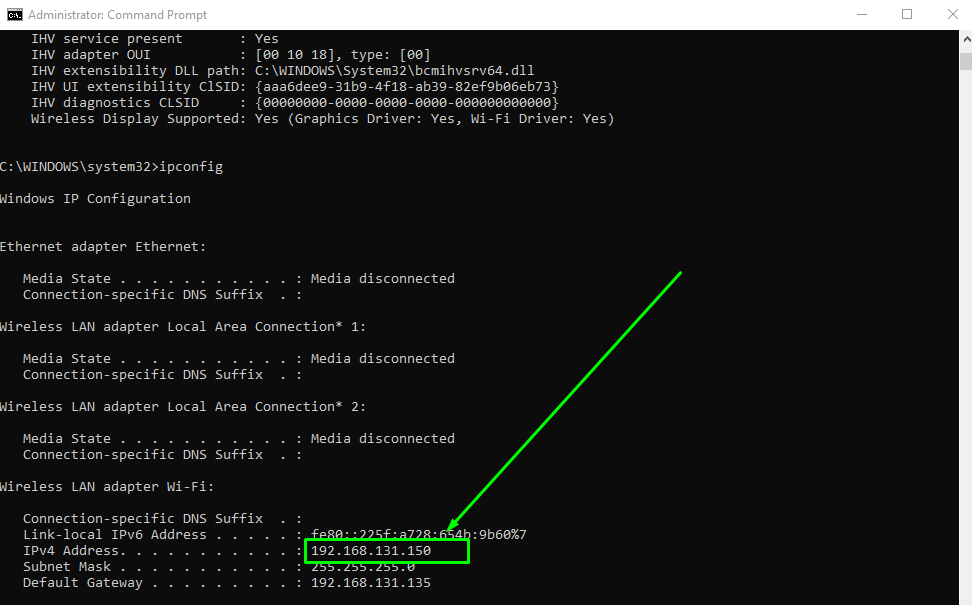 Command Prompt ওপেন করে ipconfig কমান্ড দিন। ওয়ারড কানেকশনের ক্ষেত্রে Ethernet adapter এবং ওয়ারলেসের ক্ষেত্রে Wireless LAN Adapter এ লক্ষ্য করুন।