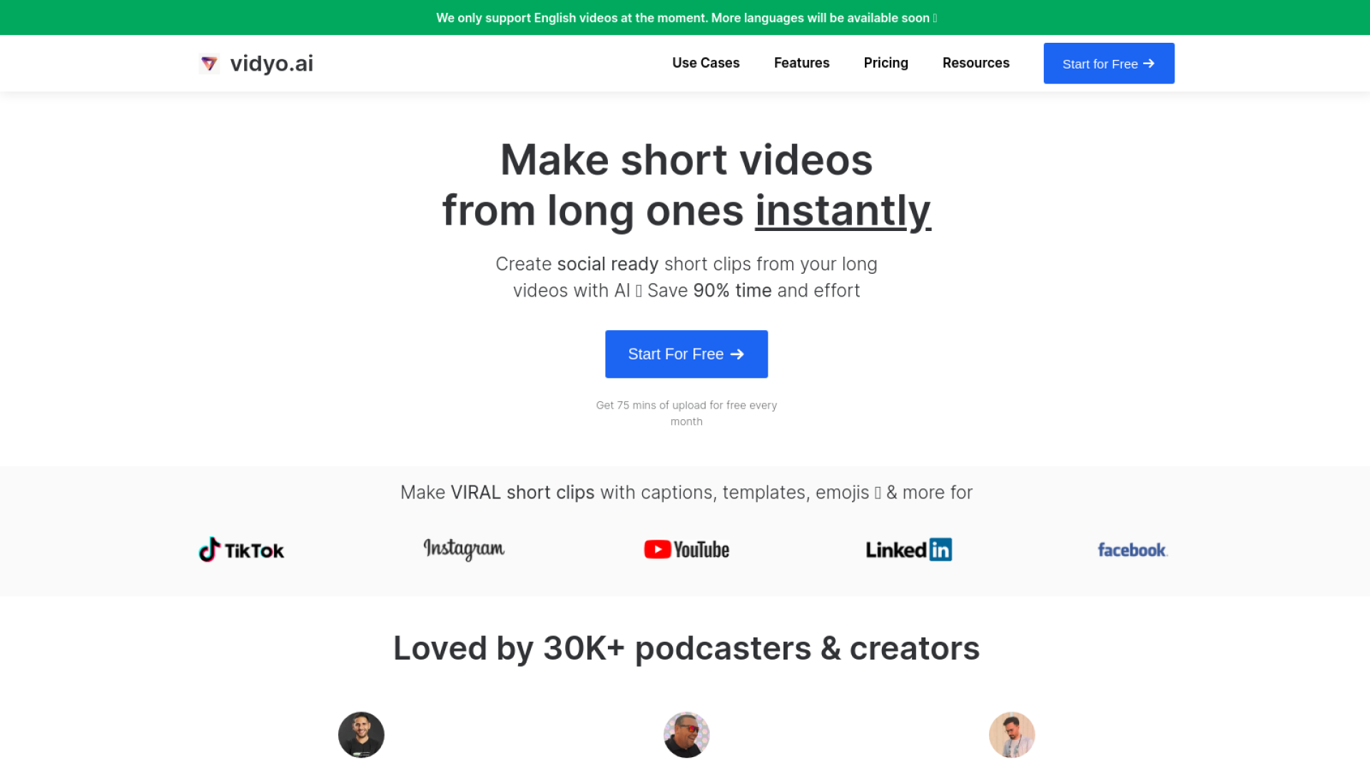 বিশেষ করে কন্টেন্ট ক্রিয়েটরদের ডিজাইন করা একটি AI হচ্ছে Vidyo.ai। এই টুলটির মাধ্যমে আপনি মুহূর্তেই যেকোনো লং ভিডিও কে শর্ট করে ফেলতে পারবেন। এই মুহূর্তে আপনি শর্ট ভিডিওর চাহিদা সম্পর্কে অবশ্যই জেনে থাকবেন।