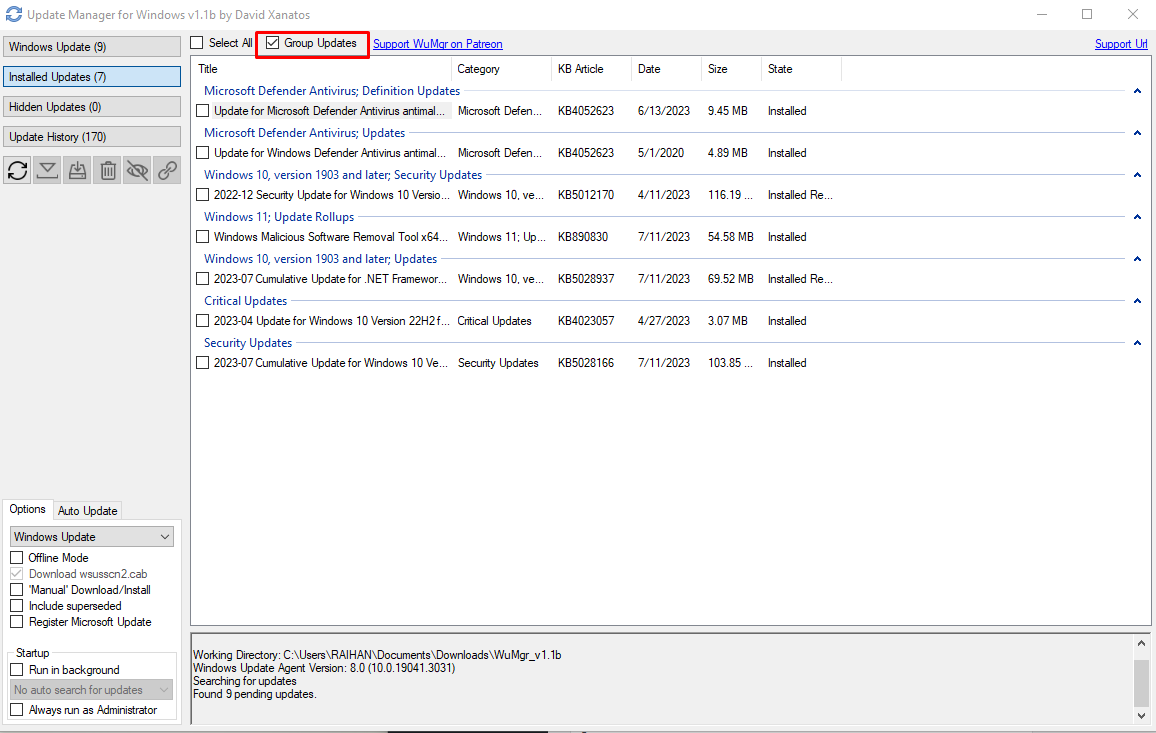 যেকোনো বাটনে ক্লিক করলে আপনাকে ডানপাশে আপডেটের Category, Release date, Size, State (Pending / Installed / Succeeded) অনুযায়ী বিস্তারিত তথ্য দেখাবে। ক্যাটাগরি অনুযায়ী আপডেট করতে স্ক্রিনের Group Updates বাটনে ক্লিক করুন।