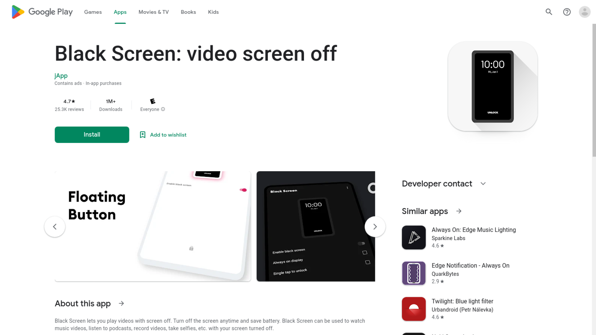 অ্যাপটি ইন্সটল করে ব্ল্যাক স্ক্রিন এনেভল করে দিন। আপনার স্ক্রিনে একটি বাটন দেখতে পাবেন। চাইলে যেকোনো জায়গাতে এটি মুভ করতে পারবেন। এবার যেকোনো কিছু প্লে করে সেই বাটনটিতে ক্লিক করুন, আপনার স্ক্রিন বন্ধ হয়ে যাবে। তবে এটা এমোলেট ডিসপ্লের জন্য উপযুক্ত।