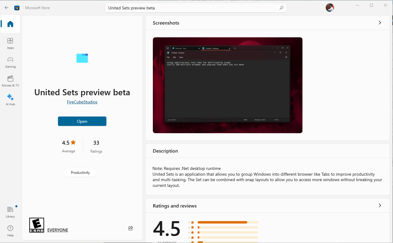 মাইক্রোসফট স্টোর লিংক @ United Sets preview beta