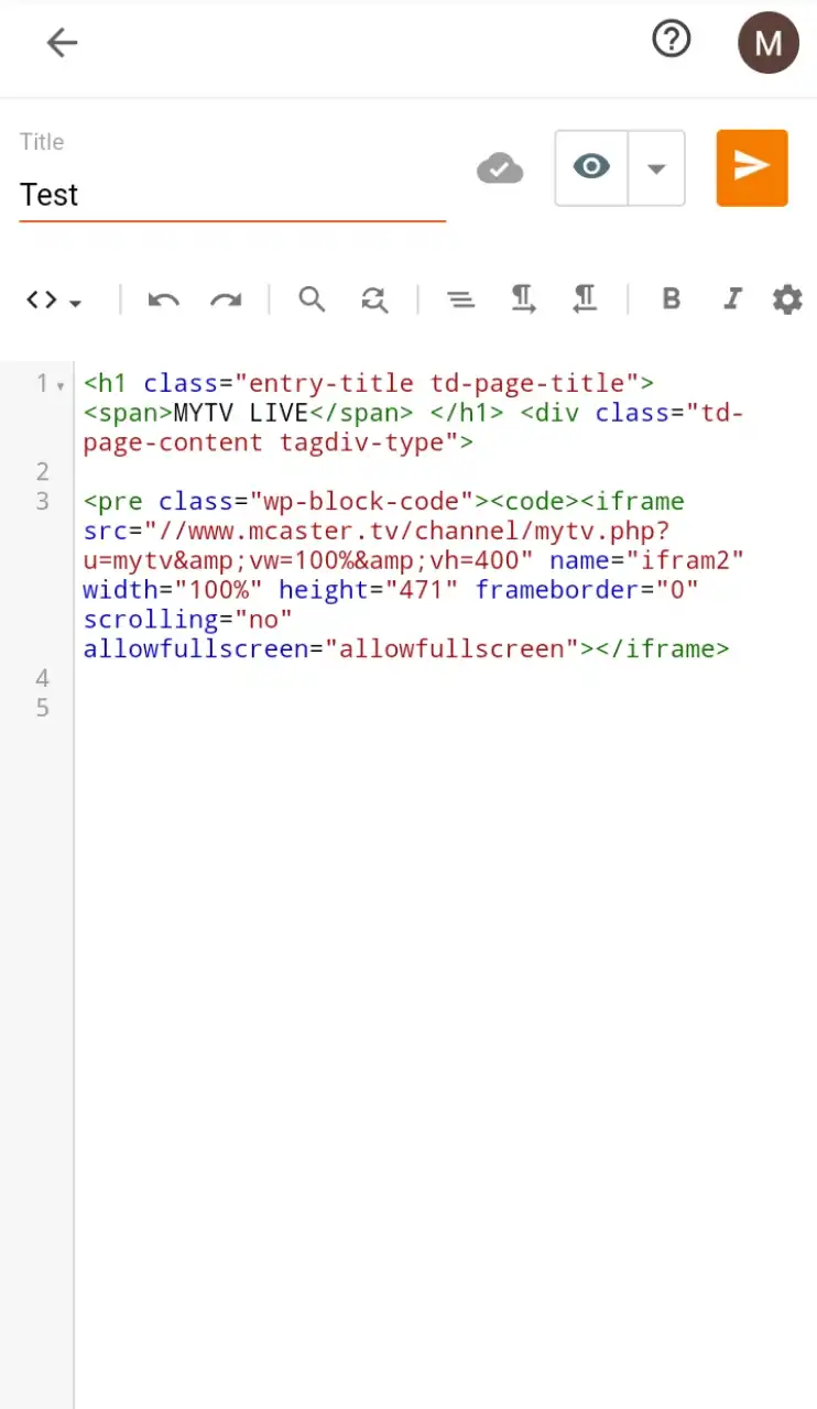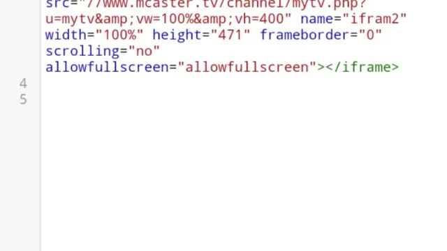 <pre class="wp-block-code"><code><iframe src="//www.mcaster.tv/channel/mytv.php?u=mytv&vw=100%&vh=400" name="ifram2" width="100%" frameborder="0" scrolling="no" allowfullscreen="allowfullscreen"></iframe>
