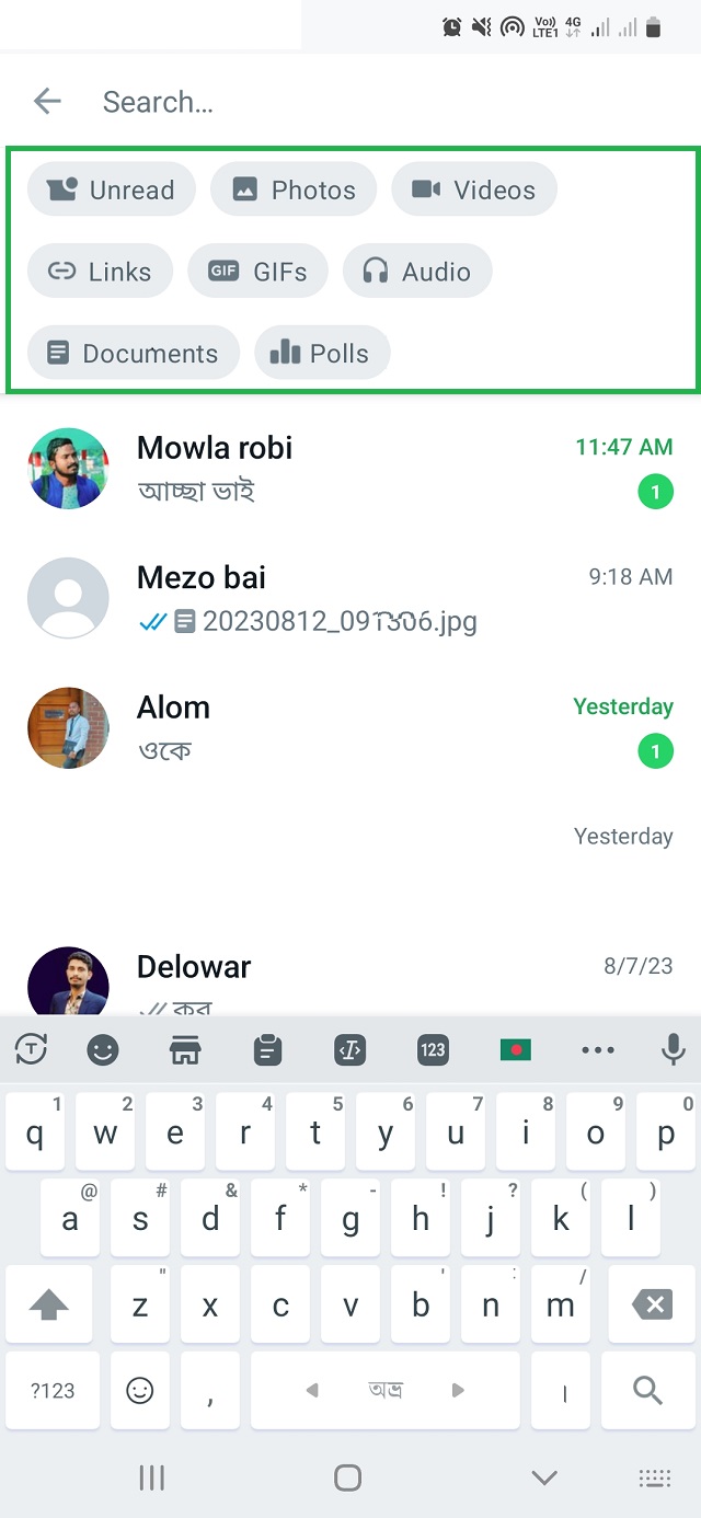 আপনি যদি নির্দিষ্ট একটি চ্যাট থেকে কন্টেন্ট টাইপ মেসেজ বের করতে চান তাহলে নিচের মেথড ফলো করুন।