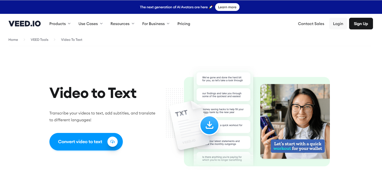 VEED এর Video To Text পেজে চলে যান, Convert video to text এ ক্লিক করুন।