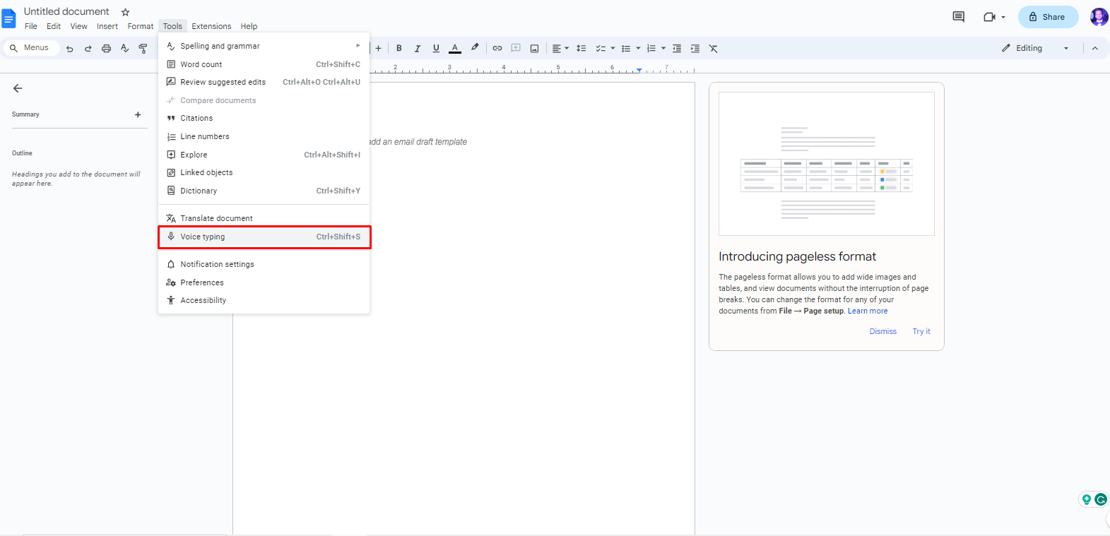 এবার Google Doc ওপেন করুন এবং Tool থেকে Voice Typing সিলেক্ট করুন।