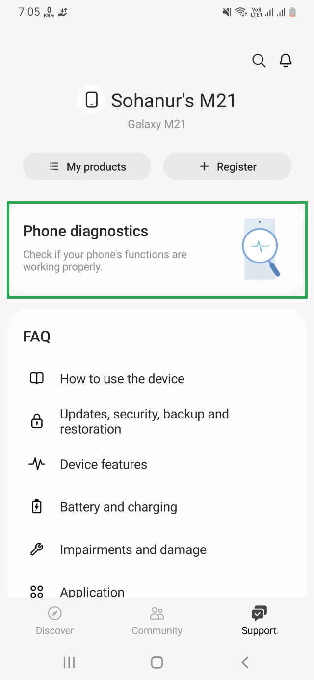 প্রথমে Member অ্যাপে যান এবং স্ক্রিনের নিচে Support ট্যাবে ট্যাপ করে Phone diagnostics এ ক্লিক করুন।
