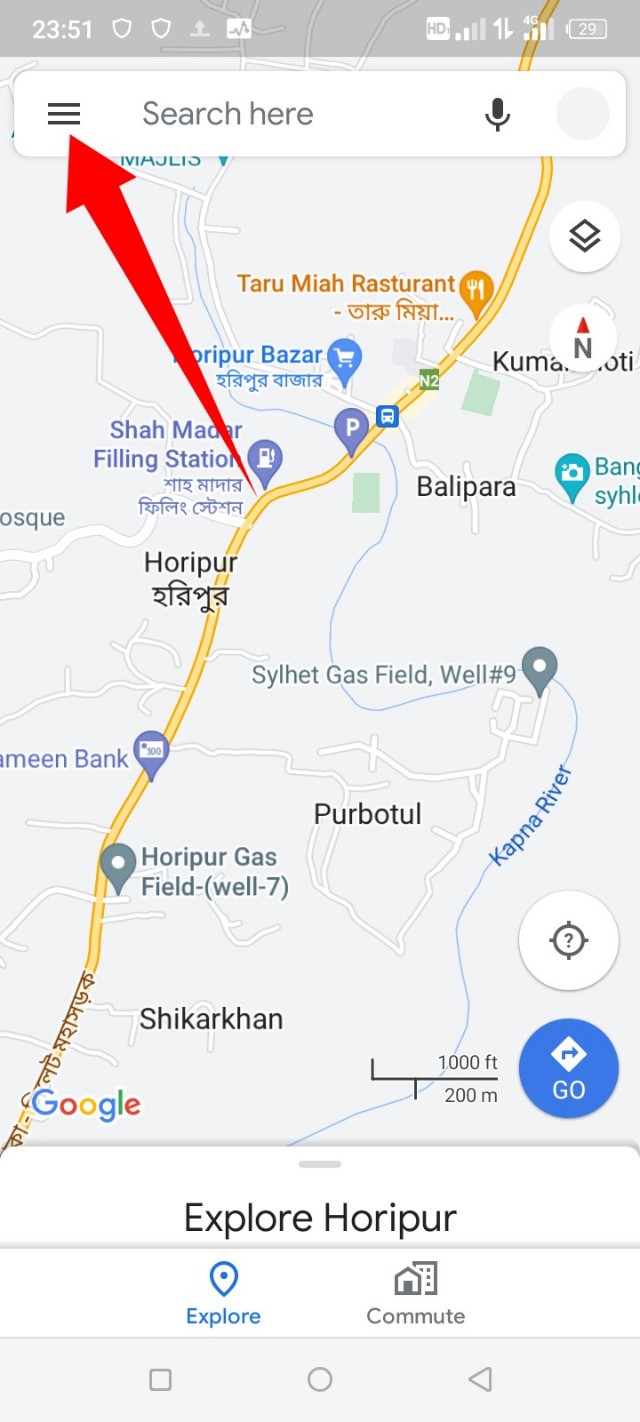 ২. Google ম্যাপসের উপরে বাম দিকে দেখতে পাবেন থ্রী-মেনু বার একটি অপশন আছে, এটির উপর ট্যাপ করুন।