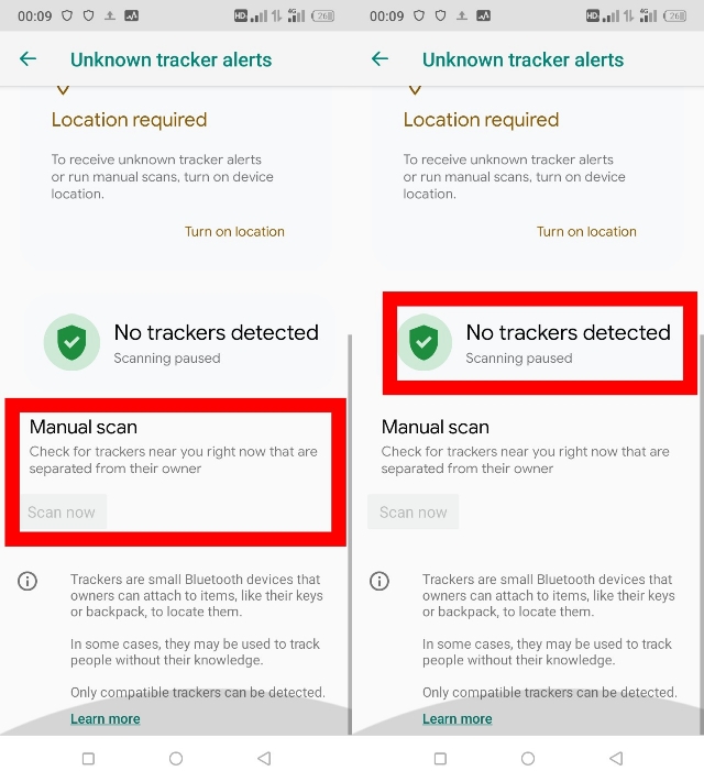 ৪. এখানে নিচের দিকে একটি অপশন দেখতে পাচ্ছেন Manual scan তার ঠিক নিচেই দেখতে পাবেন Scan now এটার উপর ট্যাপ করলেই আপনার ফোন Scan করতে শুরু করবে যে আপনার আশেপাশে কোন ট্র্যাকিং ডিভাইস আছে কি না। দেখতে পাচ্ছেন এখানে শো করছে No Trackers Detective, তার মানি আমার আশেপাশে কোন ট্র্যাকিং ডিভাইস নেই।