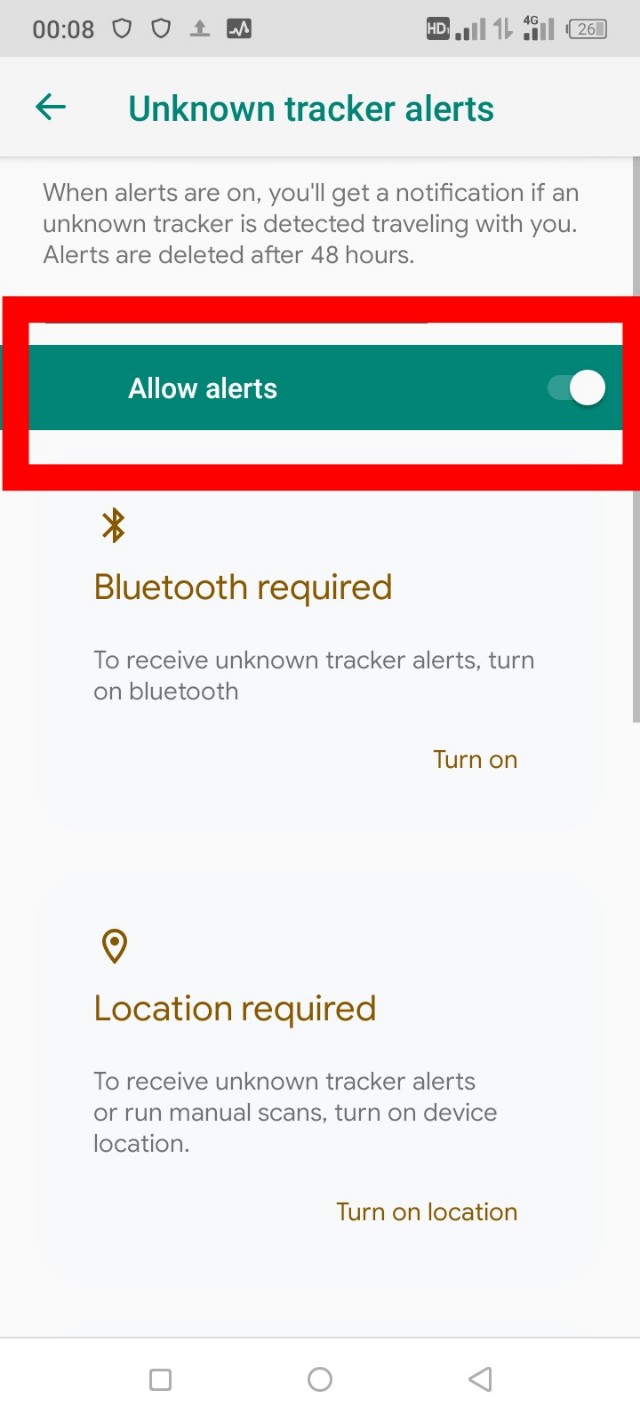 ৩. আমার এখানে দেখতে পাচ্ছেন Allow Alerts অন করা আছে, আপনার এখানে যদি এটা অফ করা থাকে তাহলে অবশ্যই এটা অন করে রাখবেন। এটা অন করা থাকলে আপনার আশেপাশের যদি কোন ট্র্যাকিং ডিভাইস থেকে থাকে তাহলে আপনার ফোনে নোটিফিকেশন পেয়ে যাবেন এবং সেটা থেকে ট্র্যাকিং অফ করার অপশনও পাবেন।