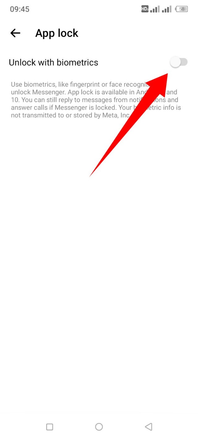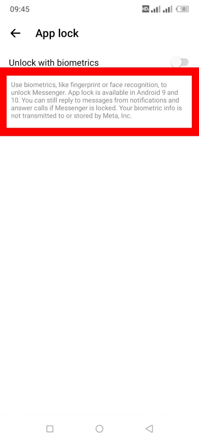 ৬. ক্লিক করার পরে এখানে Unlock with biometrics এর নিচে ফলো করুন তারা বলে দিচ্ছে যে কি কি কন্ডিশনের ভিত্তিতে আপনি আপনার মেসেঞ্জার লক করতে পারবেন। এক্ষেত্রে অবশ্যই আপনার ফোনে ফিঙ্গারপ্রিন্ট অথবা ফেইস লক থাকতে হবে এগুলো না থাকলে কিন্তু আপনার মেসেঞ্জার লক করতে পারবেন না। আপনার অ্যান্ড্রয়েড ভার্সন মিনিমাম ৯ থেকে ১০ হতে হবে এর নিচে হলে এই লক কাজ করবে না।