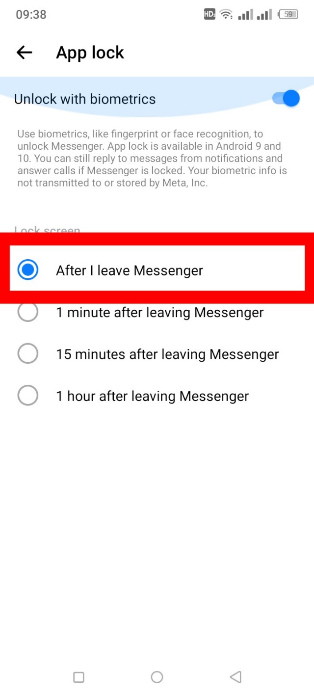 ৮. এখানে আপনাকে সিলেক্ট করতে হবে যে আপনি মেসেঞ্জার থেকে বের হওয়ার কত সময় পরে মেসেঞ্জার লক হবে। এখানে,