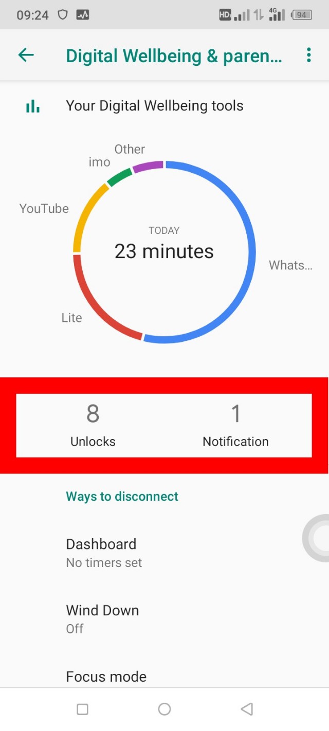 ৩. এখানে রিং এর মতো একটি অপশন দেখাচ্ছে যে আজকে আমি মোট কত সময় আমি আমার স্মার্টফোন ব্যবহার করেছি। এখানে দেখতে পাচ্ছেন Today 23 Minutes তার মানে আজকে আমি মোট ২৩ মিনিট আমার স্মার্টফোন ব্যবহার করেছি। এবং এই ২৩ মিনিট আমি Facebook lite, WhatsApp, imo, Youtube ব্যবহার করেছি