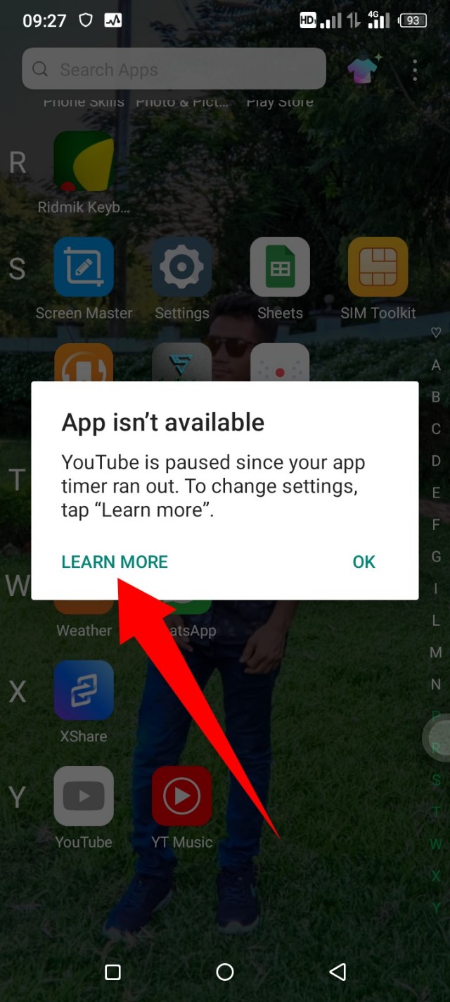 ১০. এখন অলরেডি কিন্তু আমি ৫ মিনিট ইউটিউব ব্যবহার করেছি। তাই এখানে দেখতে পাচ্ছেন ইউটিউবের কালার অন্য রকম হয়ে গেছে। এখন এটার উপর যদি আমি ক্লিক করি তাহলে দেখতে পাচ্ছেন YouTube is paused since your app time ran out. To change settings, tap Learn more
