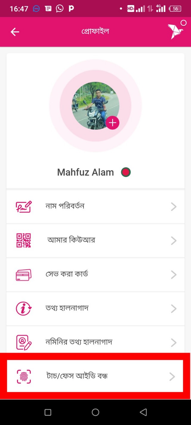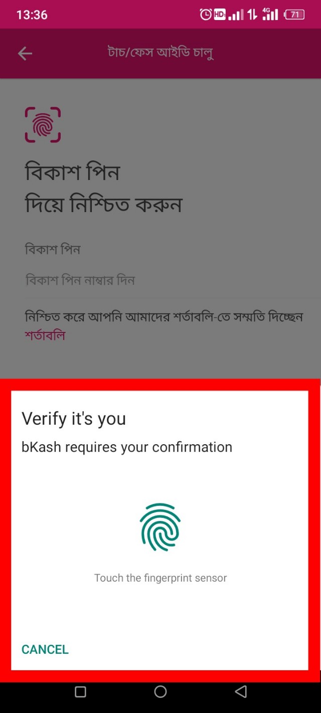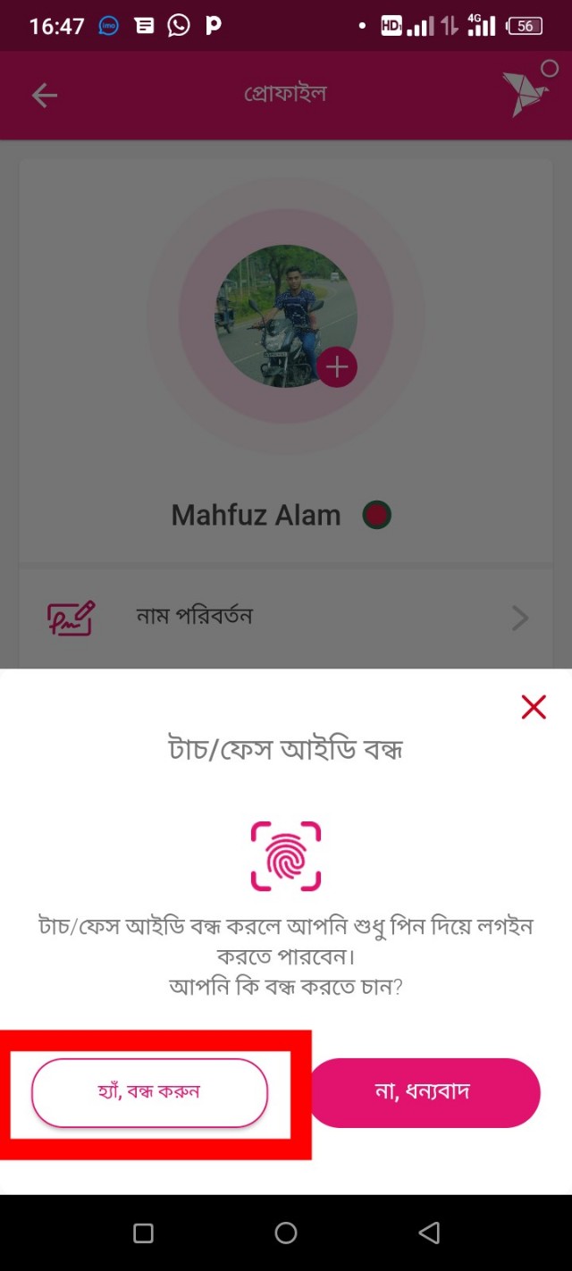 ৪. ট্যাপ করার সাথে সাথেই আপনার বিকাশ অ্যাপের ফিঙ্গারপ্রিন্ট ডিজেবল হয়ে যাবে।