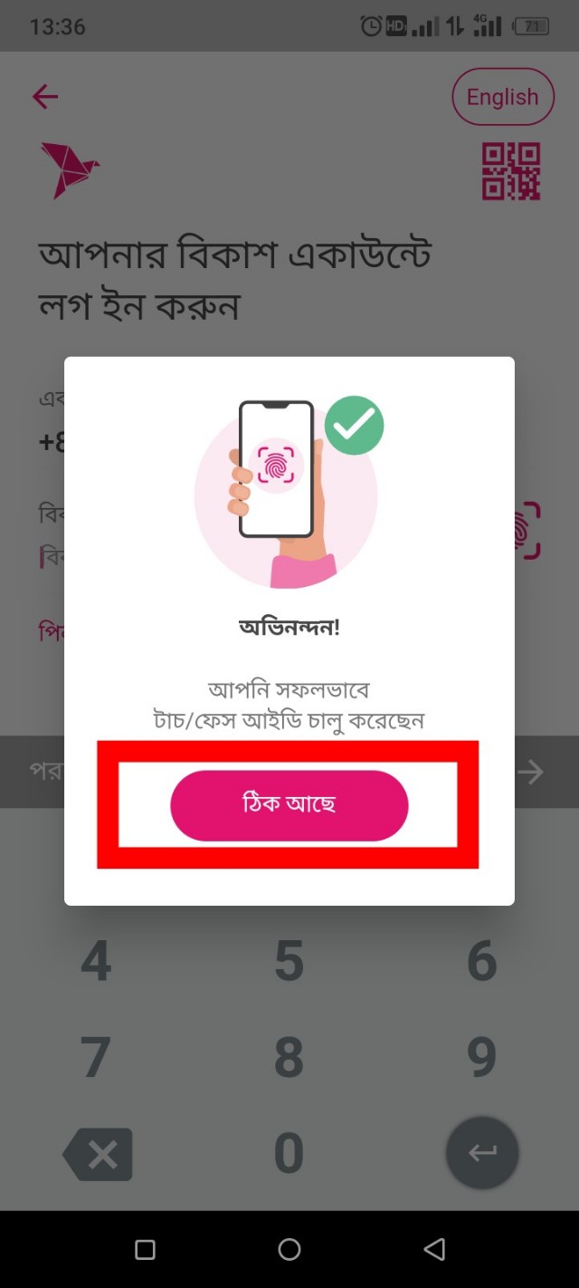 ৯. এখন আপনি সফলভাবে আপনার বিকাশে ফিঙ্গারপ্রিন্ট সেট করেছেন। এখন থেকে অর্থাৎ আপনার বিকাশ অ্যাপে ফিঙ্গারপ্রিন্ট সেট করার পর আপনি আপনার বিকাশ অ্যাকাউন্ট লগইন করতে আর পিন দিতে হবে না।