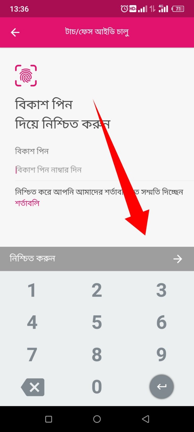 ৭. তারপর এখানে বিকাশ পিন দিয়ে নিশ্চিত করতে হবে। বিকাশ পিন দিয়ে নিশ্চিত করার পর নিচে একটি অপশন চালু হবে নিশ্চিত করুন এটার উপর ট্যাপ করবেন।