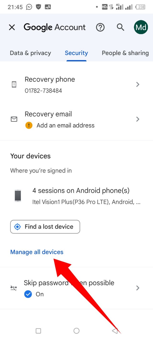 ৬. এখন আপনি মনে করেন আরো ও ডিভাইসে লগইন করা আছে তাহলে এটা দেখার জন্য Manage All Device এর উপর ট্যাপ করে দিন।