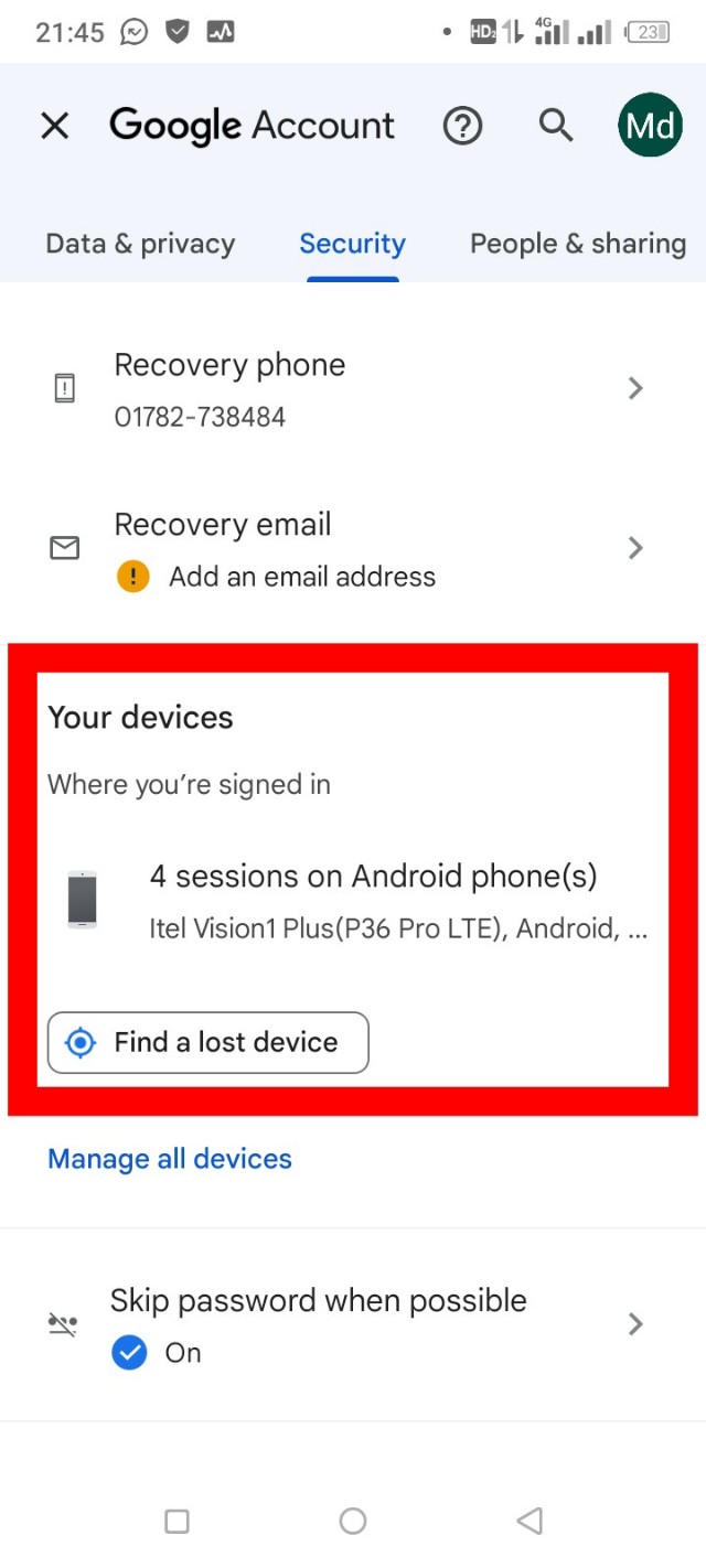 ৫. Security তে ট্যাপ করার পর আপনার সামনে নতুন একটি পেজ ওপেন হবে, আপনি একটু নিচের দিকে স্ক্রল করলেই একটি অপশন পাবেন Your Devices। Your Devices এর নিচে আপনার Gmail যতটা ডিভাইসে লগইন আছে সব গুলো এর নিচে শো করবে।