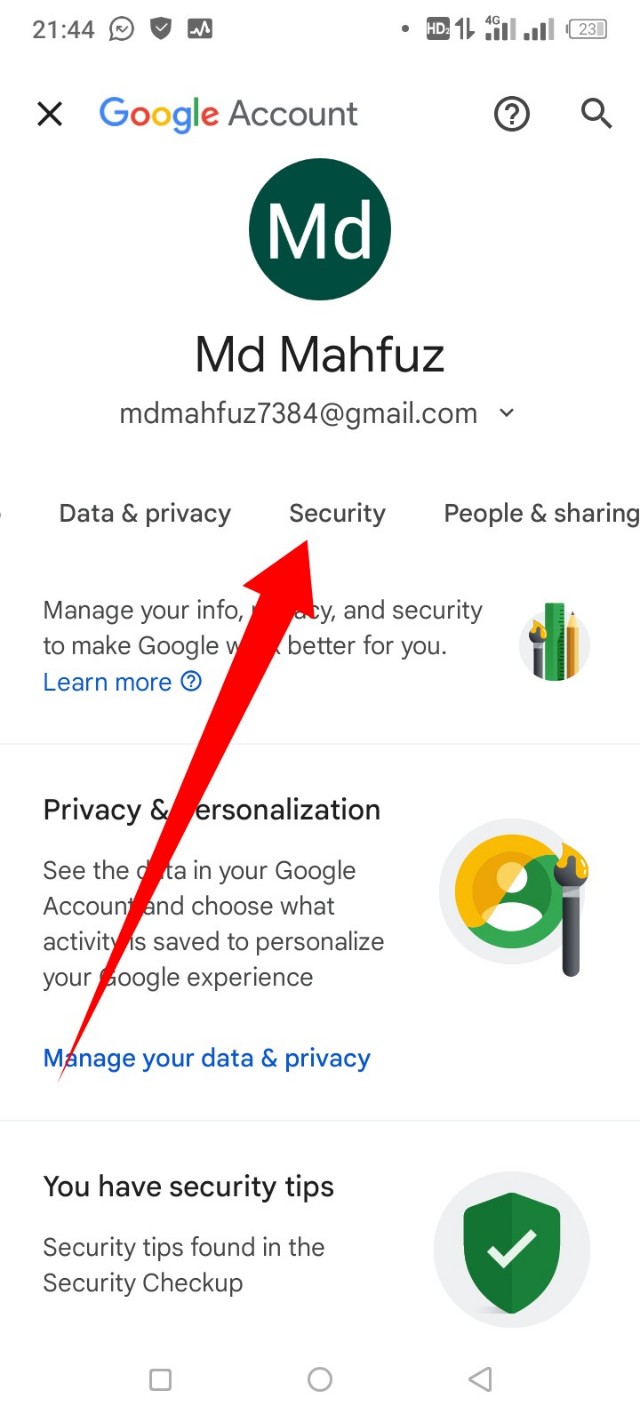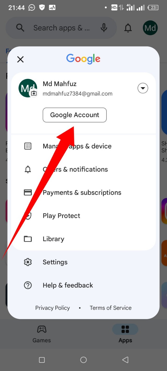 ৩. এখানে আপনার নাম এবং Gmail দেখতে পাচ্ছেন তার ঠিক নিচে Google Account লেখা আছে এটার উপর ক্লিক করে দিবেন।
