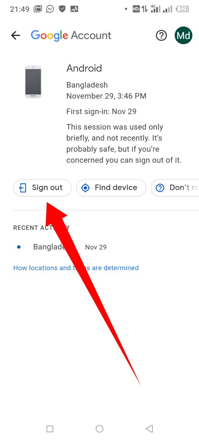 ৭. এখানে দেখতে পাচ্ছেন আমার জিমেইল টি যে মোবাইলে লগইন করা আছে সে মোবাইলের নাম এবং মডেল নাম্বার সহ শো করছে। এখন আপনি যে মোবাইল থেকে আপনার Gmail লগ আউট করতে চাচ্ছেন সে মোবাইলের যে নাম শো করছে এটার উপর ক্লিক করে দেন।