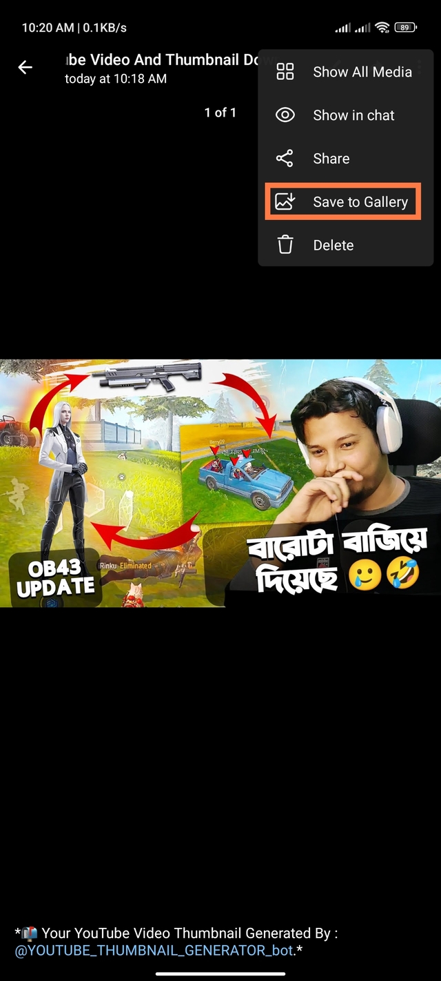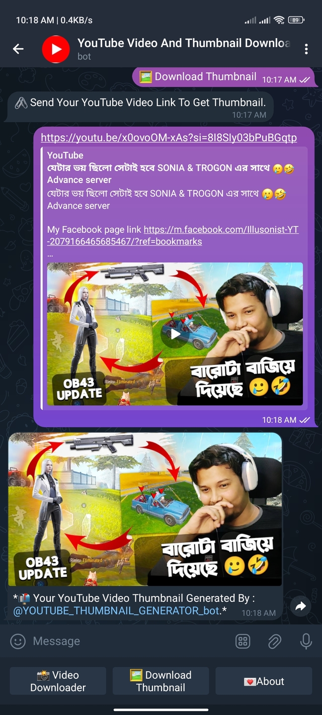 ৯. তো বন্ধুরা দেখুন বটটি সাথে সাথে আমাদের সেই ভিডিওটির হাই কোয়ালিটির থাম্বনেইল ডাউনলোড করার অপশন দিয়ে দিলো।