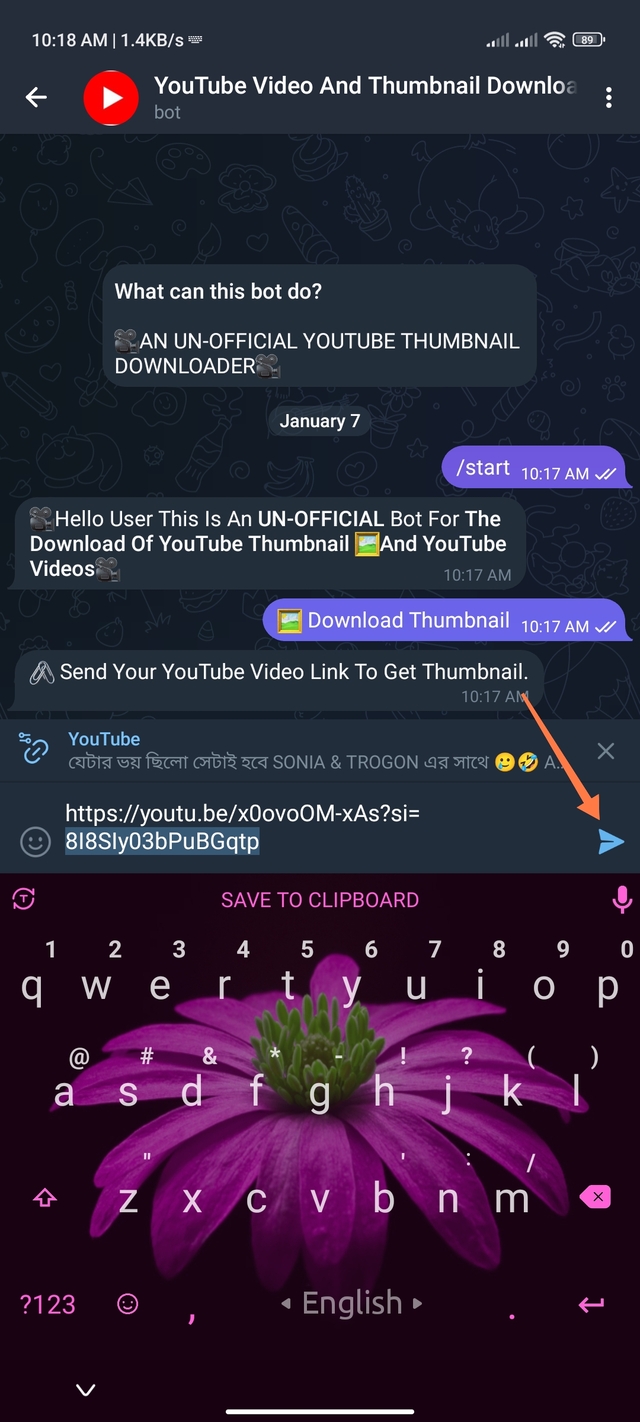 ৮. এবার আপনারা আবারো চলে যান আপনাদের সেই টেলিগ্রামের @YOUTUBE_THUMBNAIL_GENERATOR_bot বটটিতে। তারপর মেছেজ বক্সে আপনাদের কপি করে আনা ভিডিও লিংকটি পেস্ট করে দিন। আর মেছেজ টি সেন্ড করে দিন।