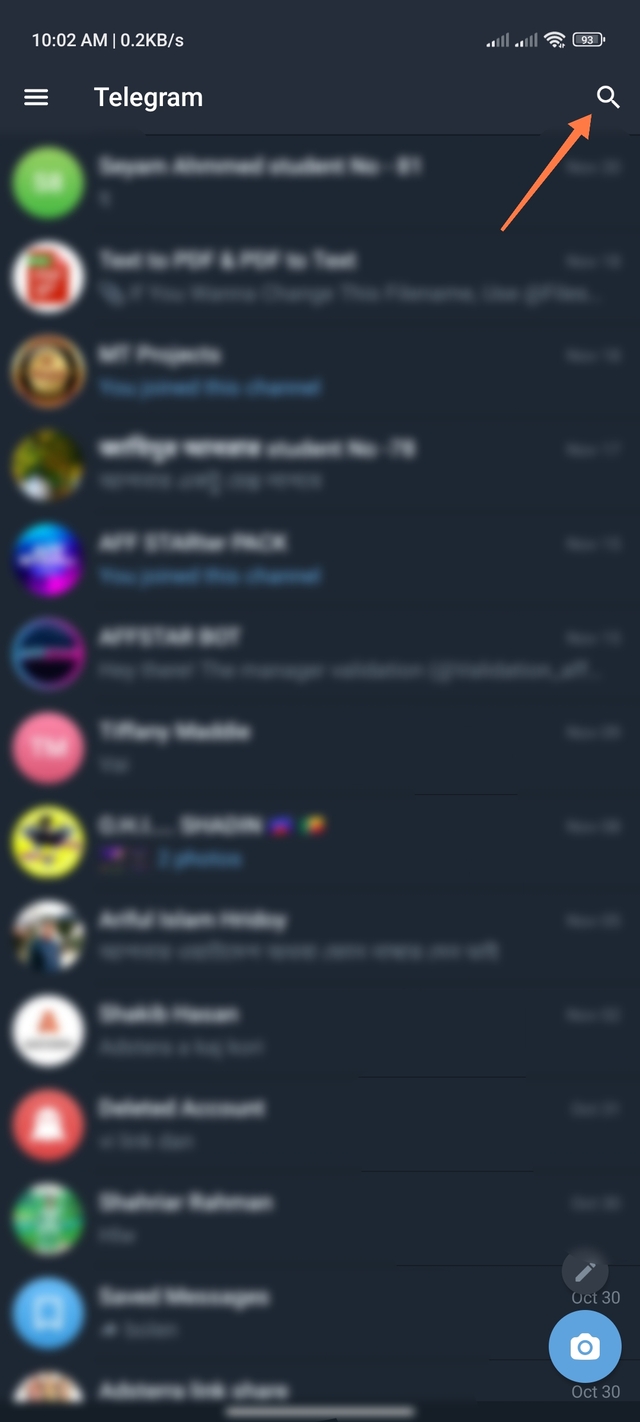 ২. এবার আপনারা Telegram অ্যাপটিতে একটি অ্যাকাউন্ট করে নিবেন বা আগে থেকেই অ্যাকাউন্ট করা থাকলে সেই অ্যাকাউন্ট টি লগ-ইন করে নিবেন। তারপর আপনারা টেলিগ্রাম অ্যাপের ডান কোণের একদম উপরে সার্চ অপশনে ক্লিক করবেন।