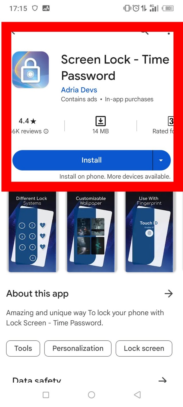 ৩. Screen Lock Time Password লিখে সার্চ করার পর আপনার সামনে একটি অ্যাপ ওপেন হবে, লোগো টি ভালো করে দেখে রাখুন। এই অ্যাপটি এখান থেকে Install করে নিতে হবে।