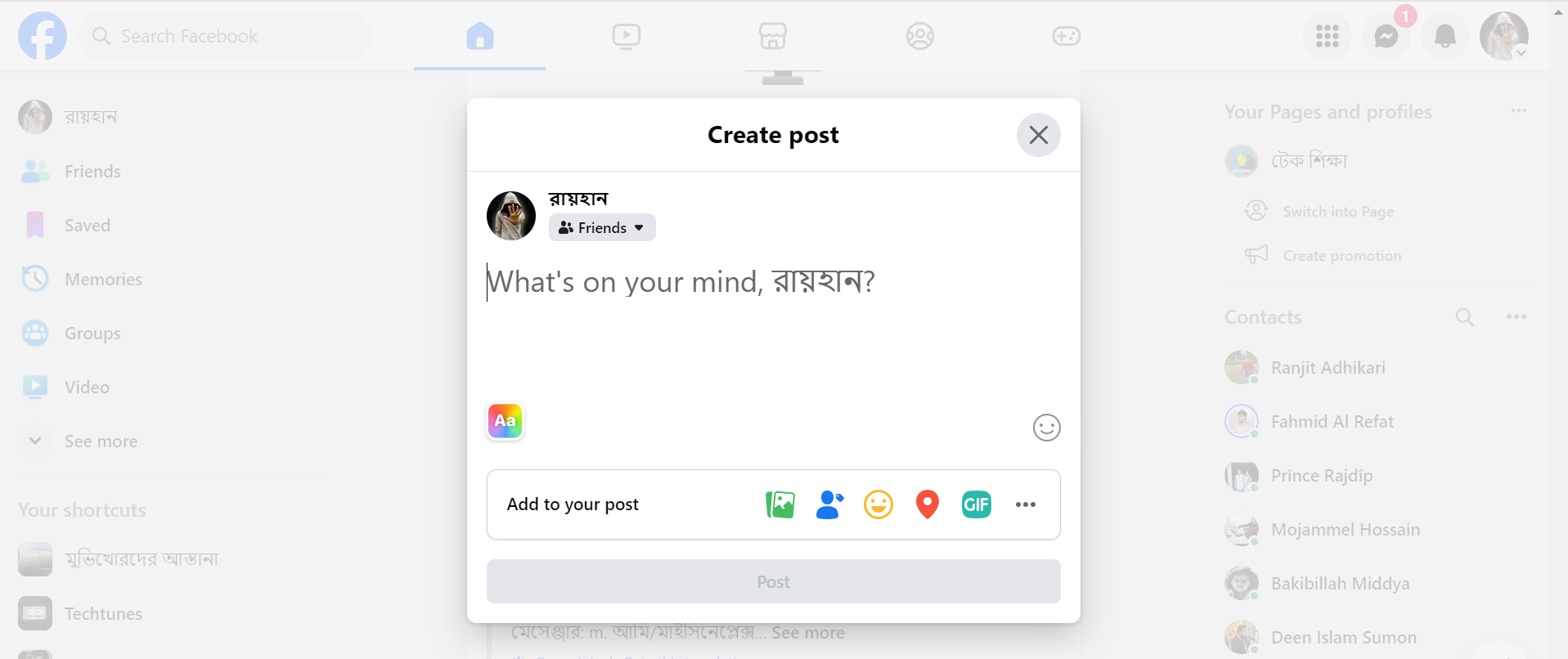 ক্রিয়েট Post এ ক্লিক করার আগে তিনটি আইকন থাকে যেমন, Live Video, Photo/Video, Feelings Activity। Post ক্রিয়েট করতে ক্লিক করলে আরও অনেক আইকন দেখা যাবে।
