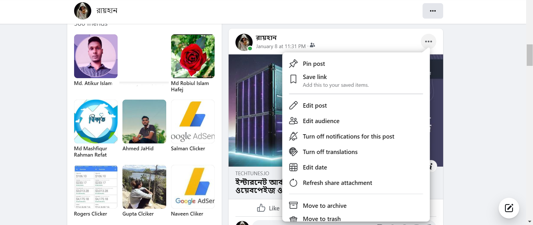 অন্যদের Post এ আপনি বিভিন্ন আইকন পাবেন যেখান থেকে Post বা ইমেজ Hide, Snooz, Silence, Unfollow, Reporting, Embedded সহ আরও অনেক কিছু করা যাবে।