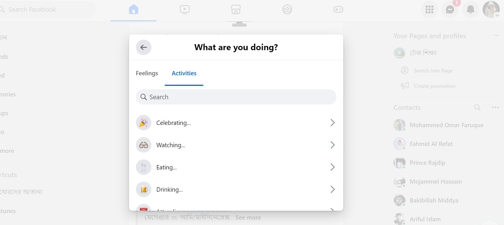 এক্টিভিটি অপশনটি বেশ চমৎকার, আপনি এই মুহূর্তে কি করছেন সেটা Post এর মাধ্যমে জানাতে পারবেন। এক্টিভিটি এড করলে সেটা নিউজফিডে আপনার নামের পাশে দেখাবে।
