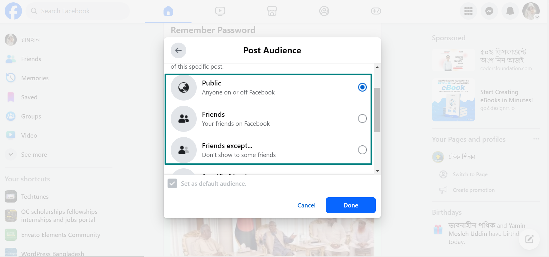Post ক্রিয়েট ফিচারের সবচেয়ে গুরুত্বপূর্ণ অংশ হচ্ছে অডিয়েন্স সিলেক্ট করা। চলুন জেনে নেয়া যাক অডিয়ন্সের কোন আইকন দ্বারা কি বুঝায়,