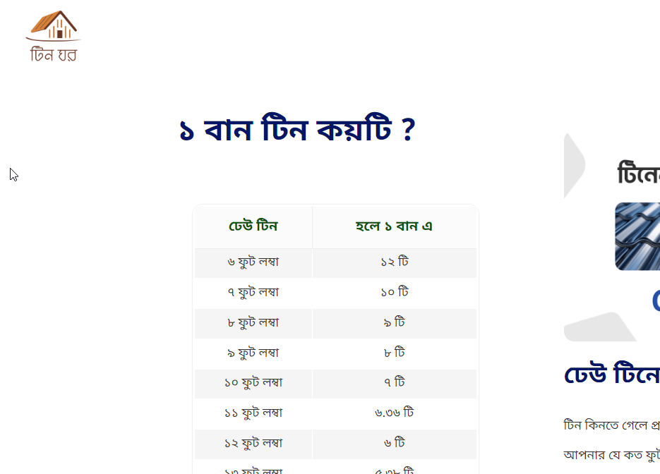 ঘরের এক পাশের দৈর্ঘ্য ও এক পাশের প্রস্থ এর মাপ থেকে আপনার চারপাশের বেড়া এর মধ্যে কতগুলো টিন লাগবে সেইটা পাবেন এইখান থেকে।