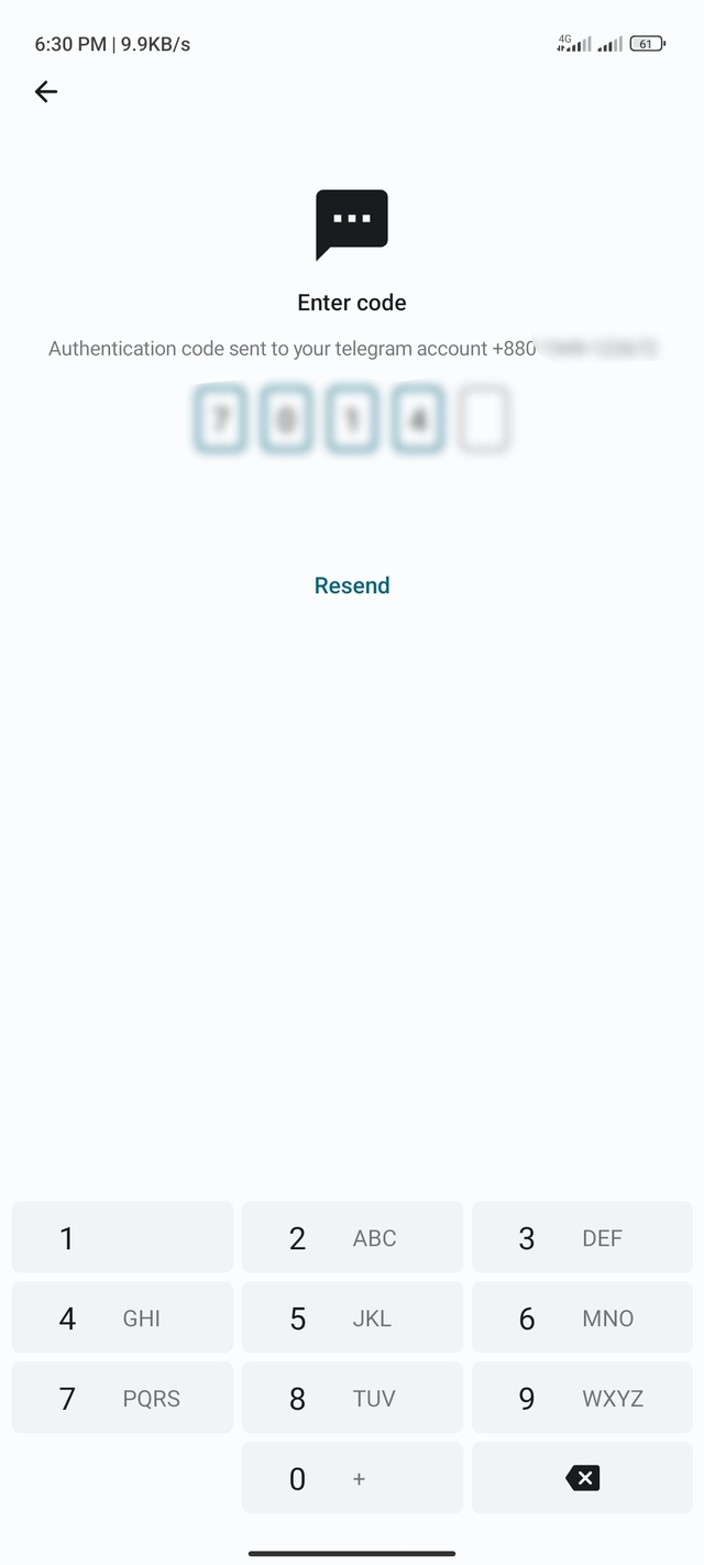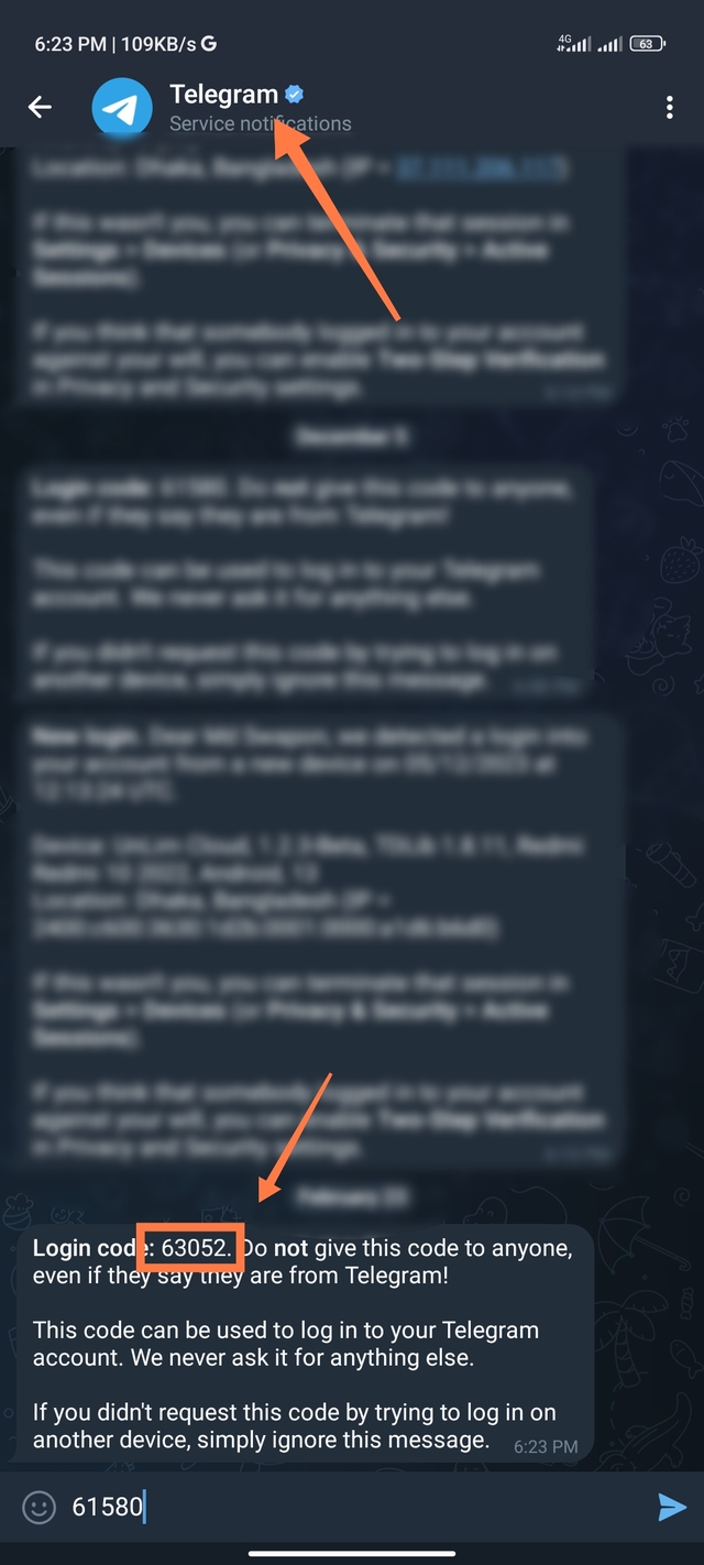 ৬. তারপর একটু লোডিং হবে আপনারা অপেক্ষা করবেন। এবার আপনাদেরকে কোড দিয়ে ভেরিফাই করতে বলবে। কোডটি আপনারা পাবেন আপনাদের টেলিগ্রাম অ্যাকাউন্টে। কোডটি নেওয়ার জন্য আপনারা আপনাদের টেলিগ্রাম অ্যাকাউন্টে যান।