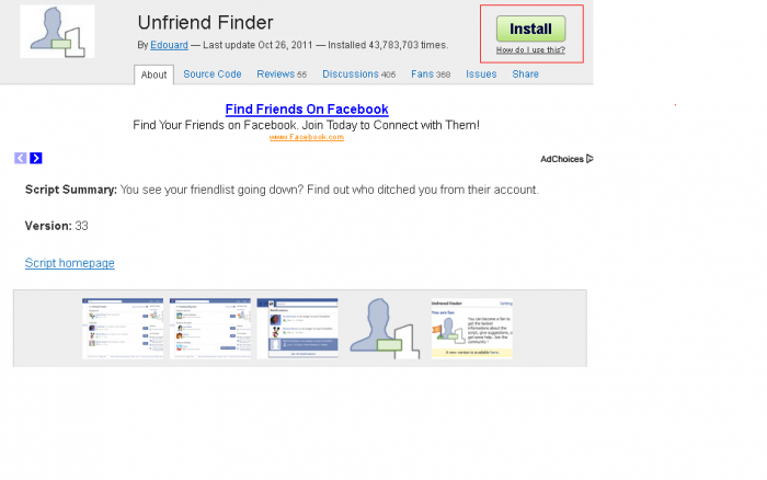 এবার Install লেখাতে ক্লিক করে Unfriend Finder স্ক্রিপ্ট টি আপনার ব্রাউজারে ইন্সটল করে নিন।