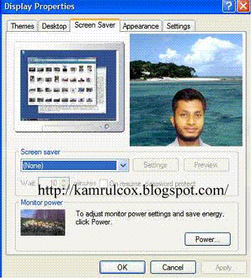 ২। ওখানে bmp নামের যে ইমেজটি দেখতে পাচ্ছেন সেটি হলো ScreenSaver এর প্রিভিউ এরিয়া। আপনি যে ScreenSaver সেট করেন তা ওখানে প্রিভিউ দেখা যায়। আপনি ওটাকে ড্রাগ করে বা সিলেক্ট করে এরো কীব্যবহার করে বামে বা ডানে সরান। আমি বামে সরিয়েছি। আর ডানপাশে আমার ছবিটি এড করবো। কারণ আমার ইমেজটি(180x180) বর্তমান খালি জায়গায়হবেনা। আমি বামে সরালাম।
