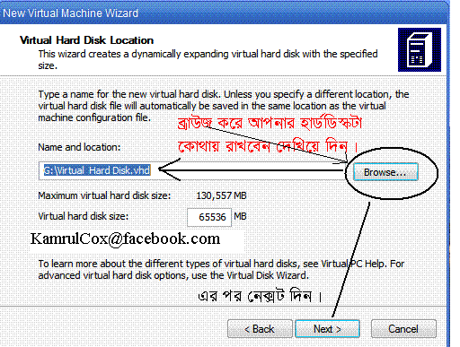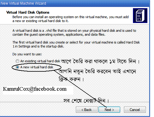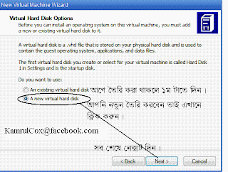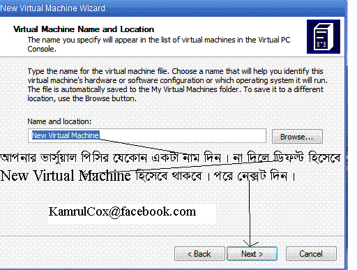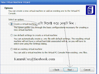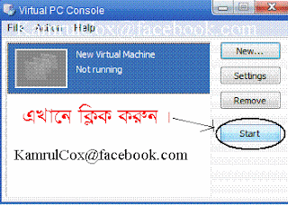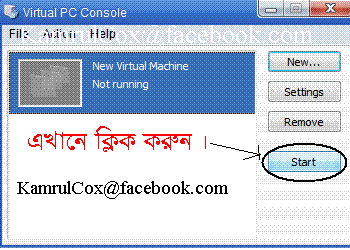 Install করার পর All Programs থেকে Microsoft Virtual PC রান করুন। এখন আপনাকে একটা ভার্সুয়াল পিসি আরেকটা হার্ডস্ক তৈরি করতে হবে। যেকোন ড্রাইভের যেকোন জায়গায় তা করতে পারেন। ভার্সুয়াল হার্ডডিস্কের জন্য আপনার হার্ডডিস্কের প্রায় ২ জিবি মত জায়গা খরচ হবে। কিন্তু সেটা ভার্সুয়াল পিসিতে অনেক বড় সাইজ দেখঅবে। নিচের ছবিগুলো দেখে কাজ শুরু করুন।